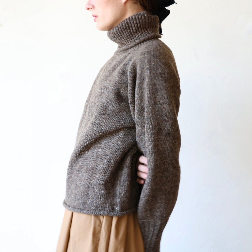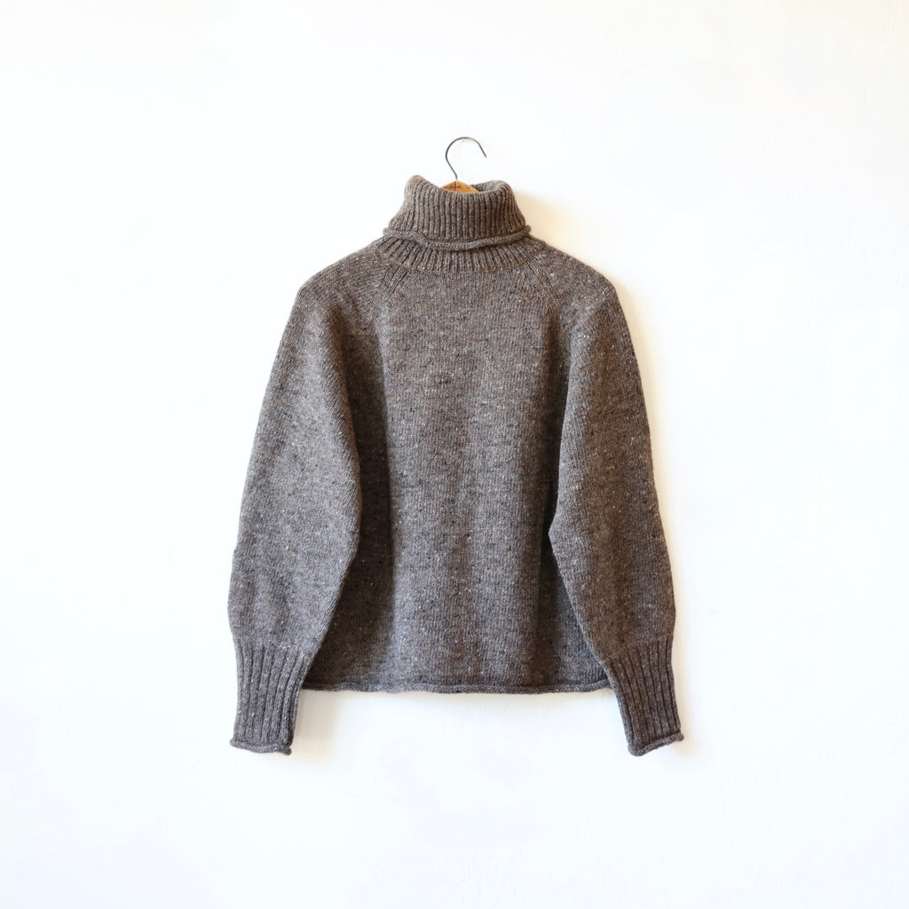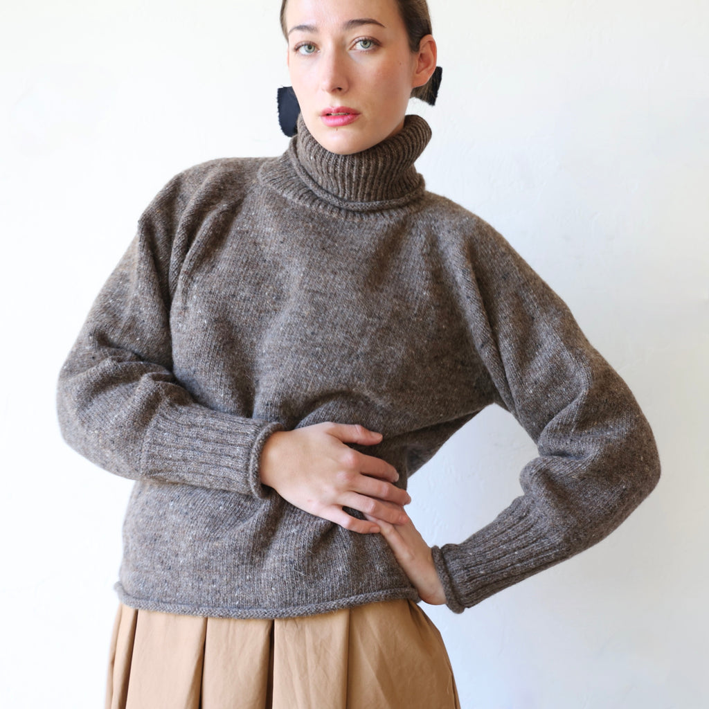 A gorgeous turtleneck sweater with flecked alpaca and merino wool yarn, creating a delicate tweed with a beautifully rich color. We love the flecks of variegated color. The hem of the neckline, cuffs and the sweater are rolled hems. The sleeves have a beautiful, roomy fit that cinch back in at the long ribbed cuffs. This has such an easy, beautiful fit, we love it for every day wear!