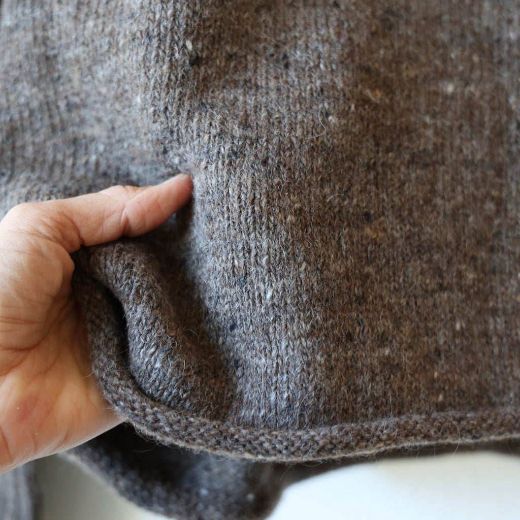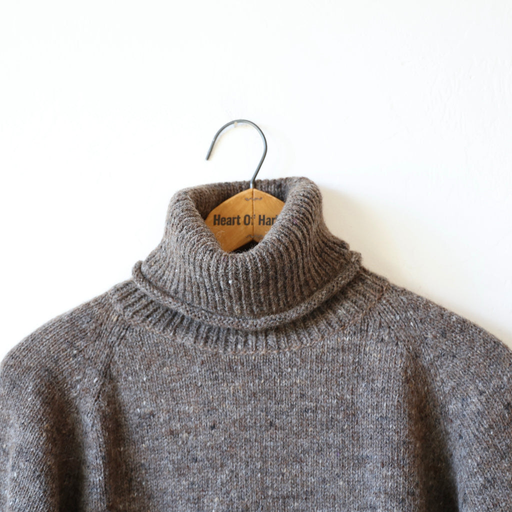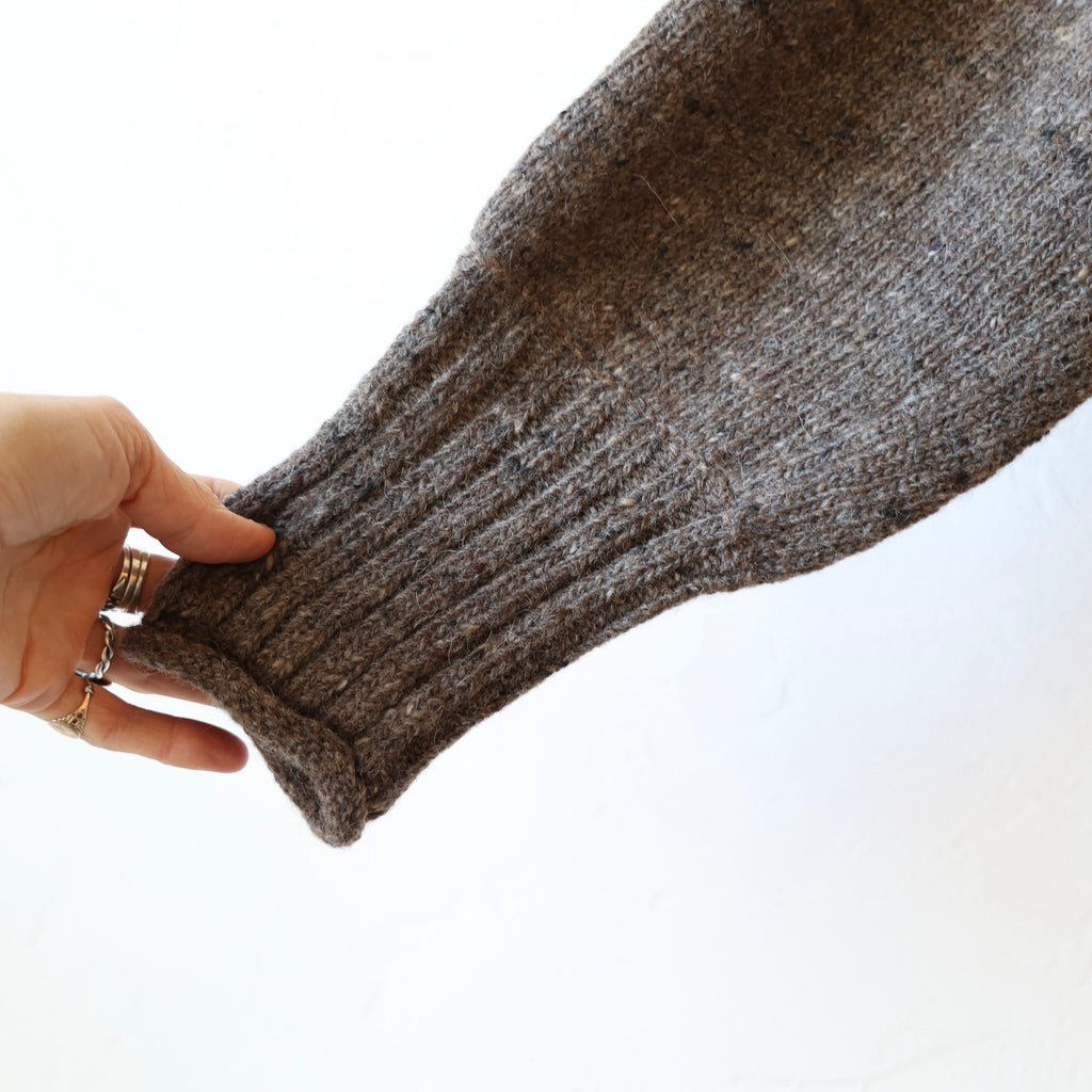 A gorgeous turtleneck sweater with flecked alpaca and merino wool yarn, creating a delicate tweed with a beautifully rich color. We love the flecks of variegated color. The hem of the neckline, cuffs and the sweater are rolled hems. The sleeves have a beautiful, roomy fit that cinch back in at the long ribbed cuffs. This has such an easy, beautiful fit, we love it for every day wear!