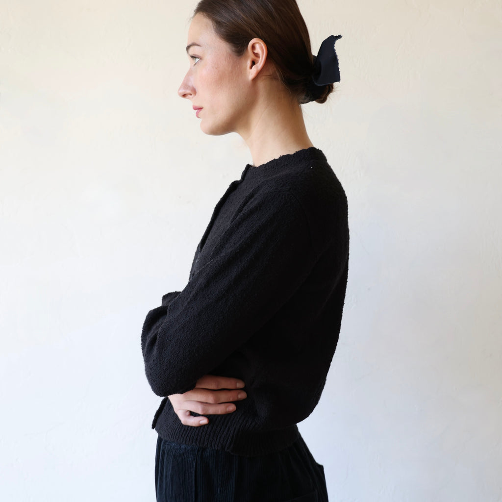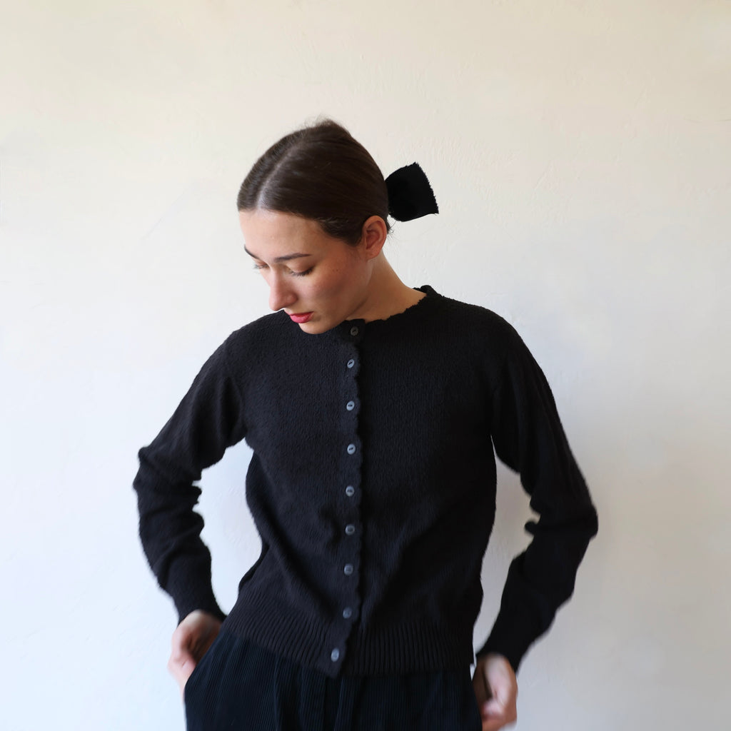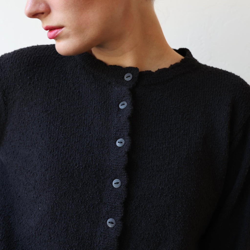 A beautiful cardigan made of an organic cotton bouclé. This has great texture! This is inspired by the designer's mom's childhood ski sweater. It has horn buttons and scallop detailing along the button placket and around the neckline. It's a super sweet piece that's great to wear with high waisted pants and skirts.