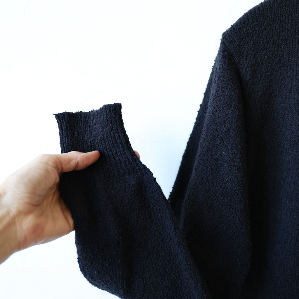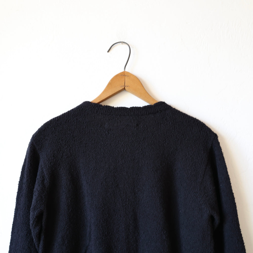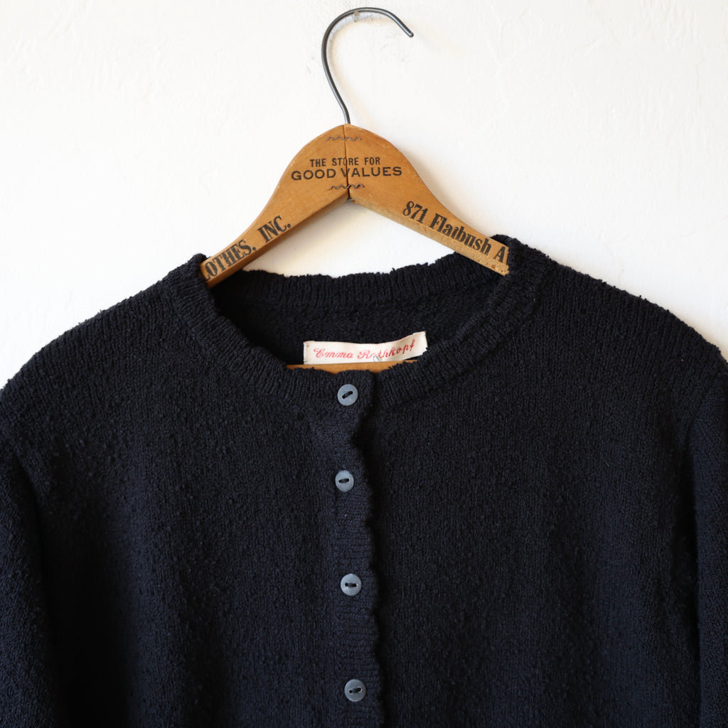 A beautiful cardigan made of an organic cotton bouclé. This has great texture! This is inspired by the designer's mom's childhood ski sweater. It has horn buttons and scallop detailing along the button placket and around the neckline. It's a super sweet piece that's great to wear with high waisted pants and skirts.