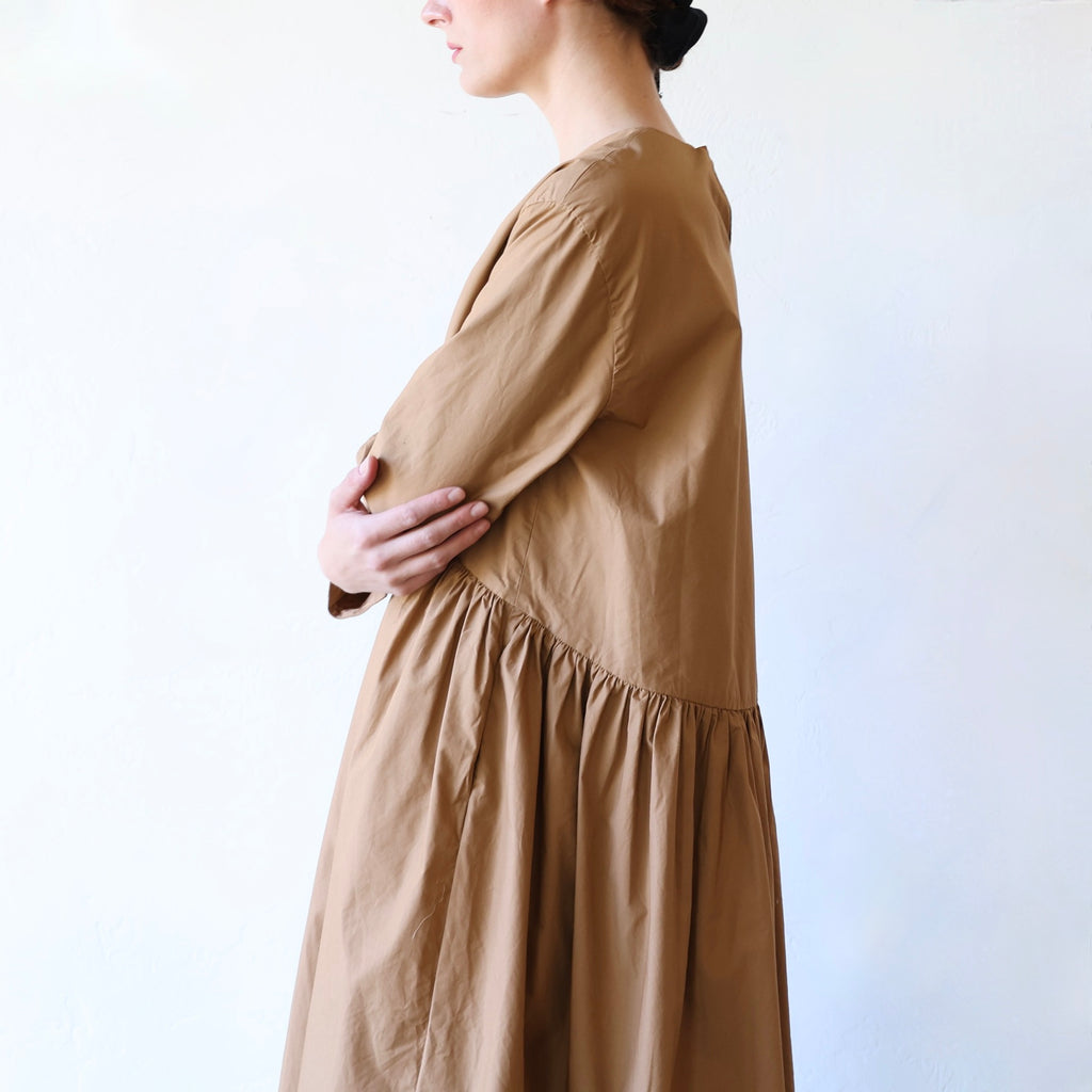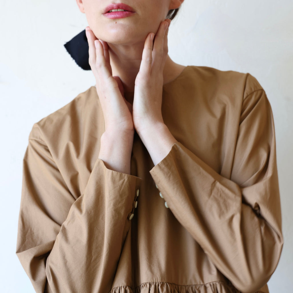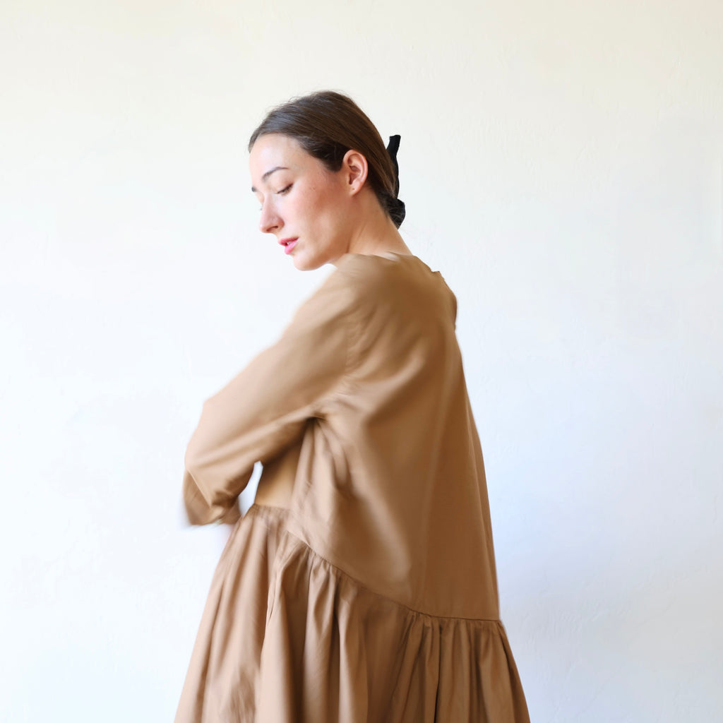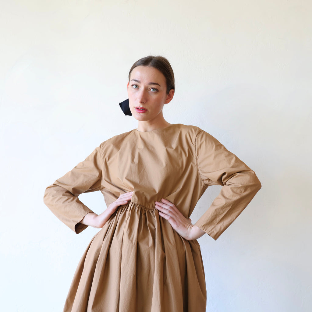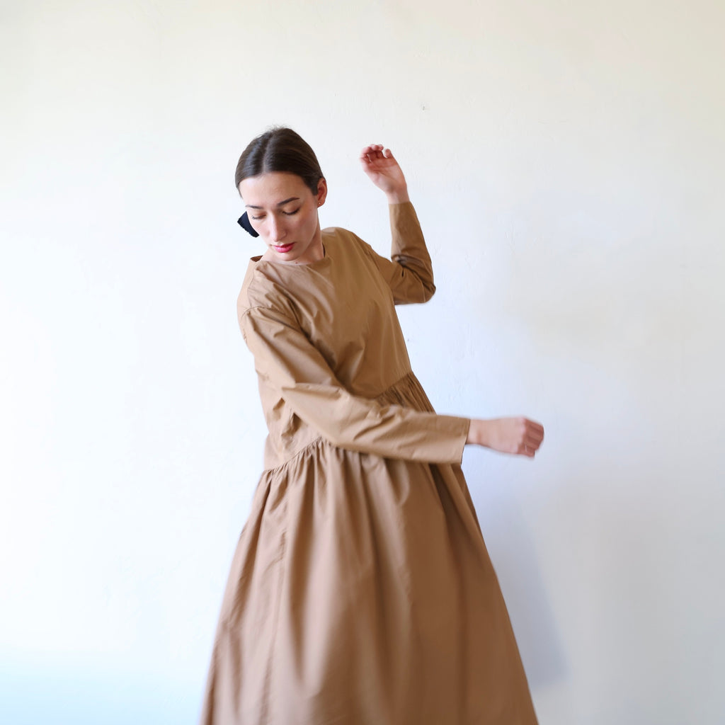 A beautiful dress made of a crisp cotton. We love the simplicity of this dress with the  detail of the buttons at the cuffs. The bodice is self lined for added warmth. It has a classic rounded neckline and long sleeves. The waistline is curved - shorter in the front and longer in the back. The hemline also has a longer length in the back. It has side seam pockets. This looks great on - we love it with Repetto jazz shoes or the Le Monde Beryl mary janes.