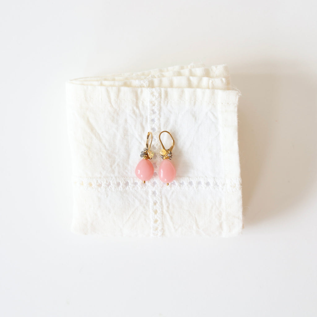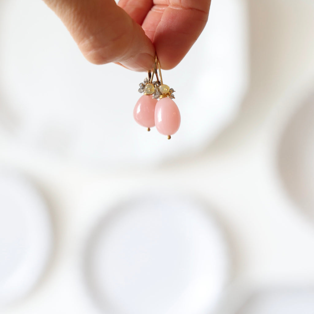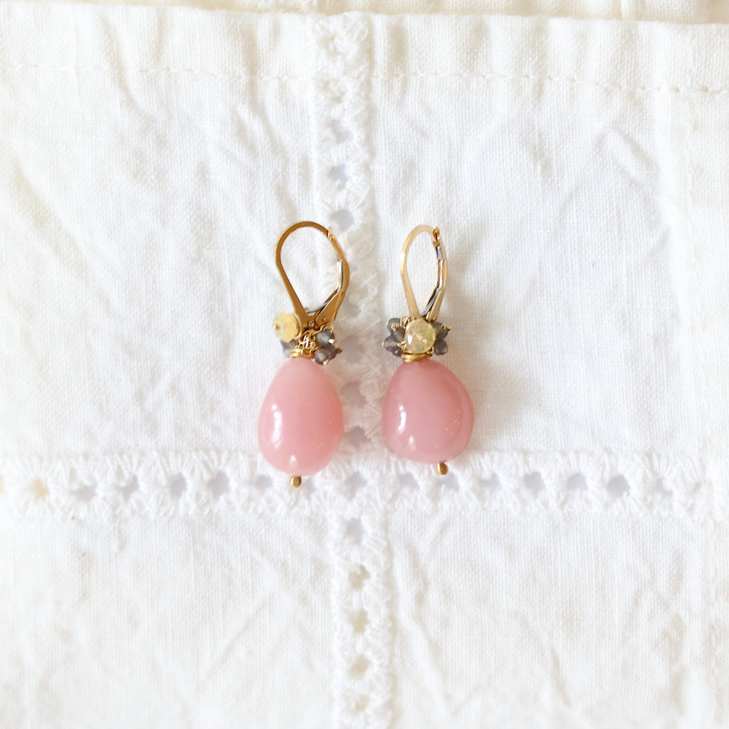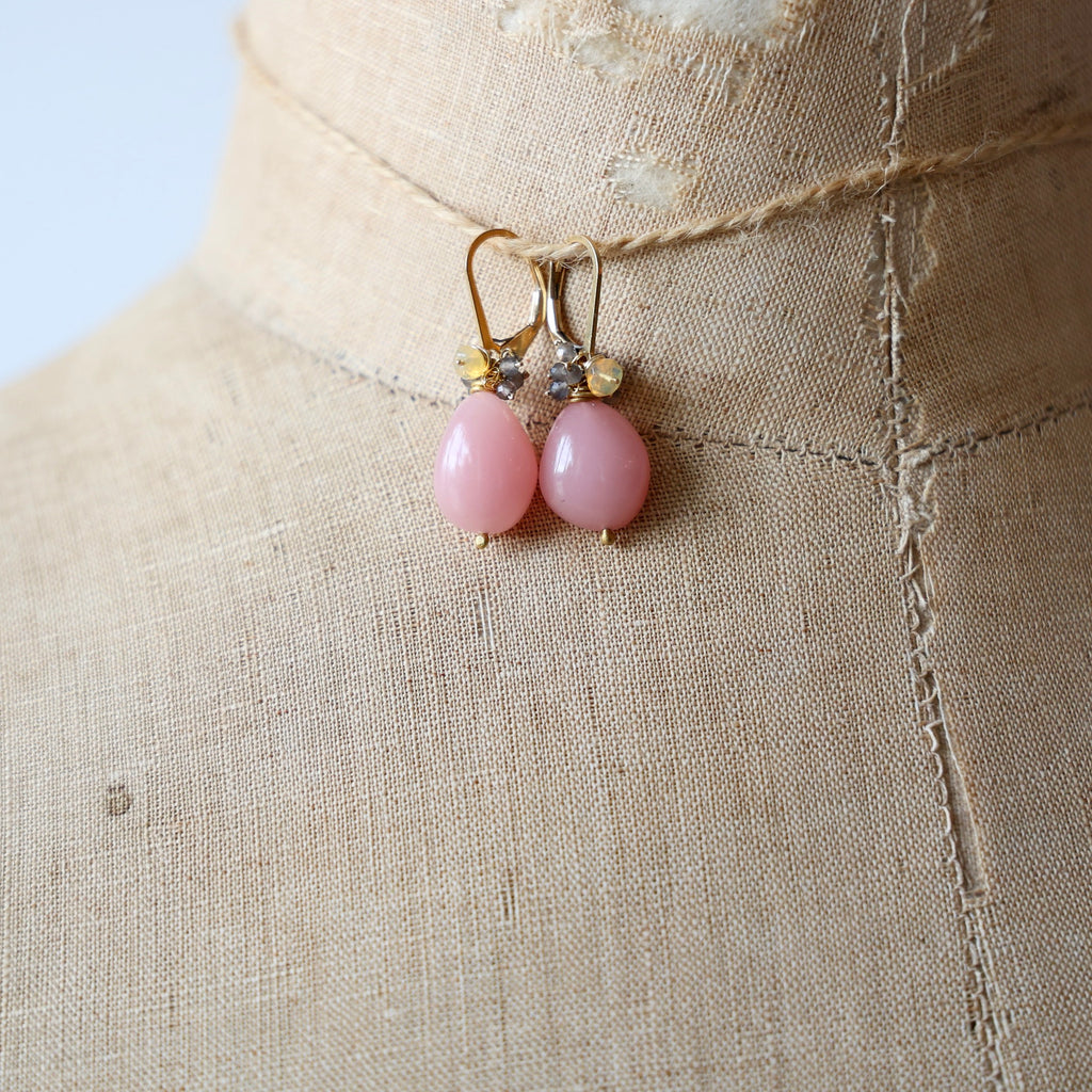 Rare polished quartz drops with ethiopian opal and smokey moonstone fringe. The hooks are 14k gold fill leverbacks.
