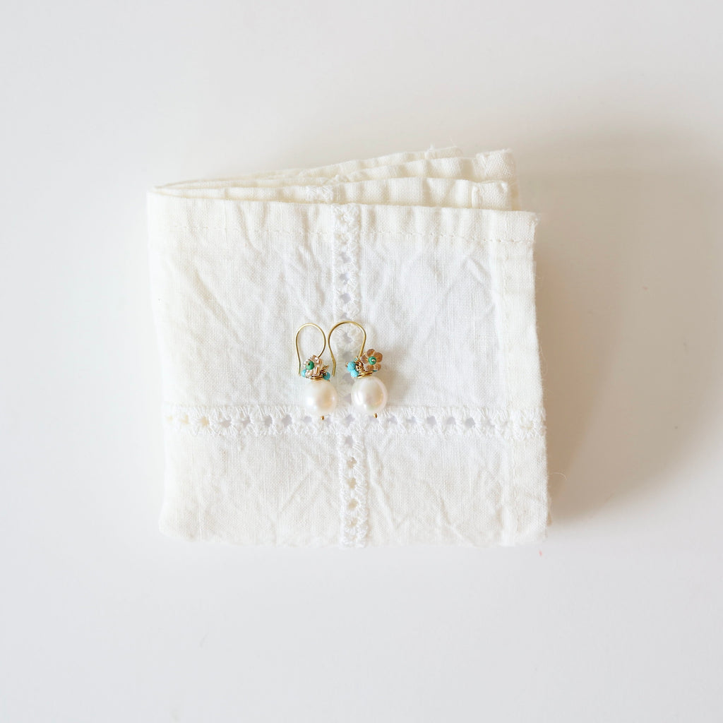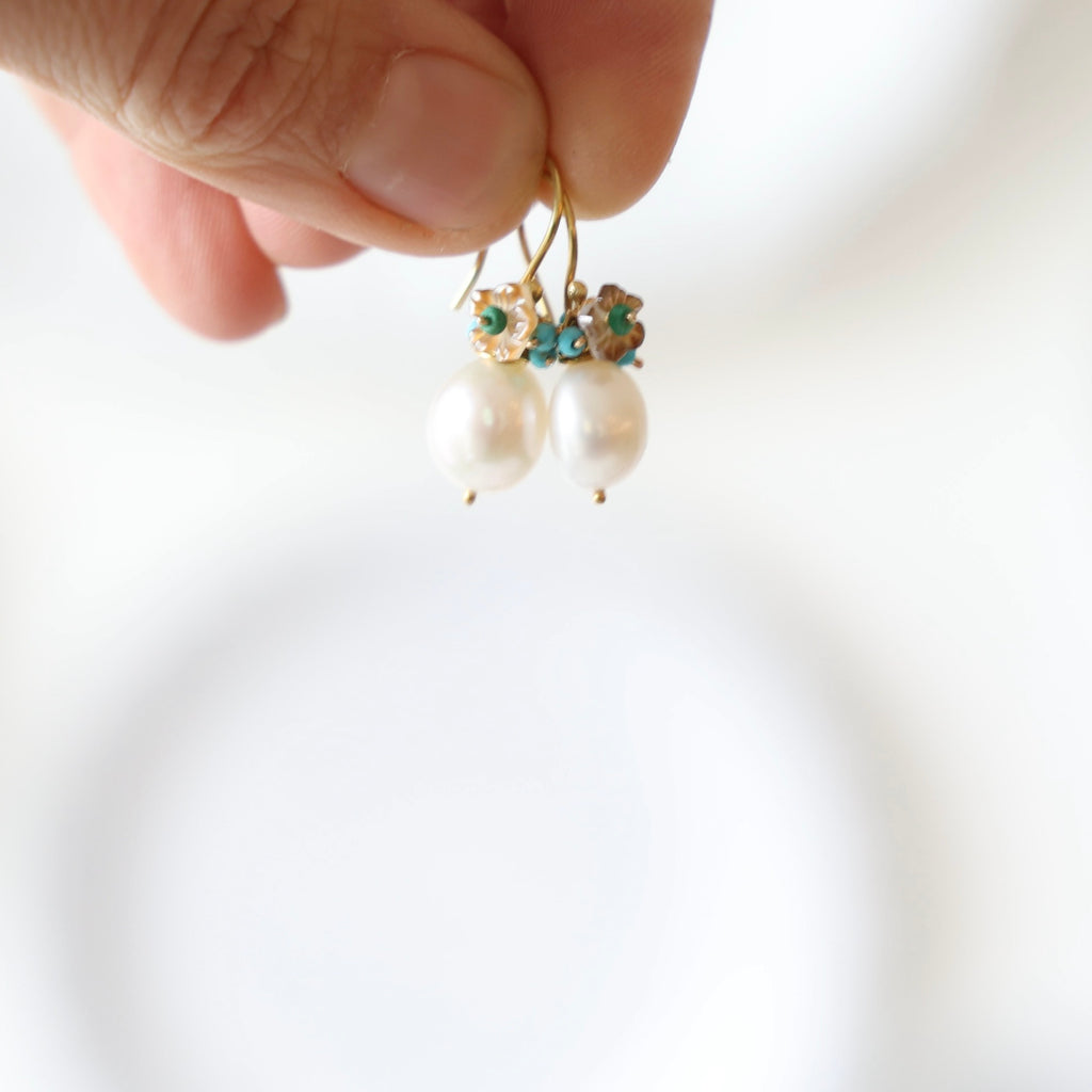 Beautiful cultured white pearl earrings with grey shell flowers and turquoise fringe. The hooks are made of 24k gold fill.
