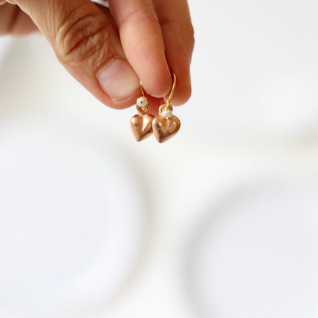 Pretty rose gold vermeil heart earrings, cast from mexican milagro hearts. These have an antique pearl detail at the top of each heart. 14k gold fill hooks.