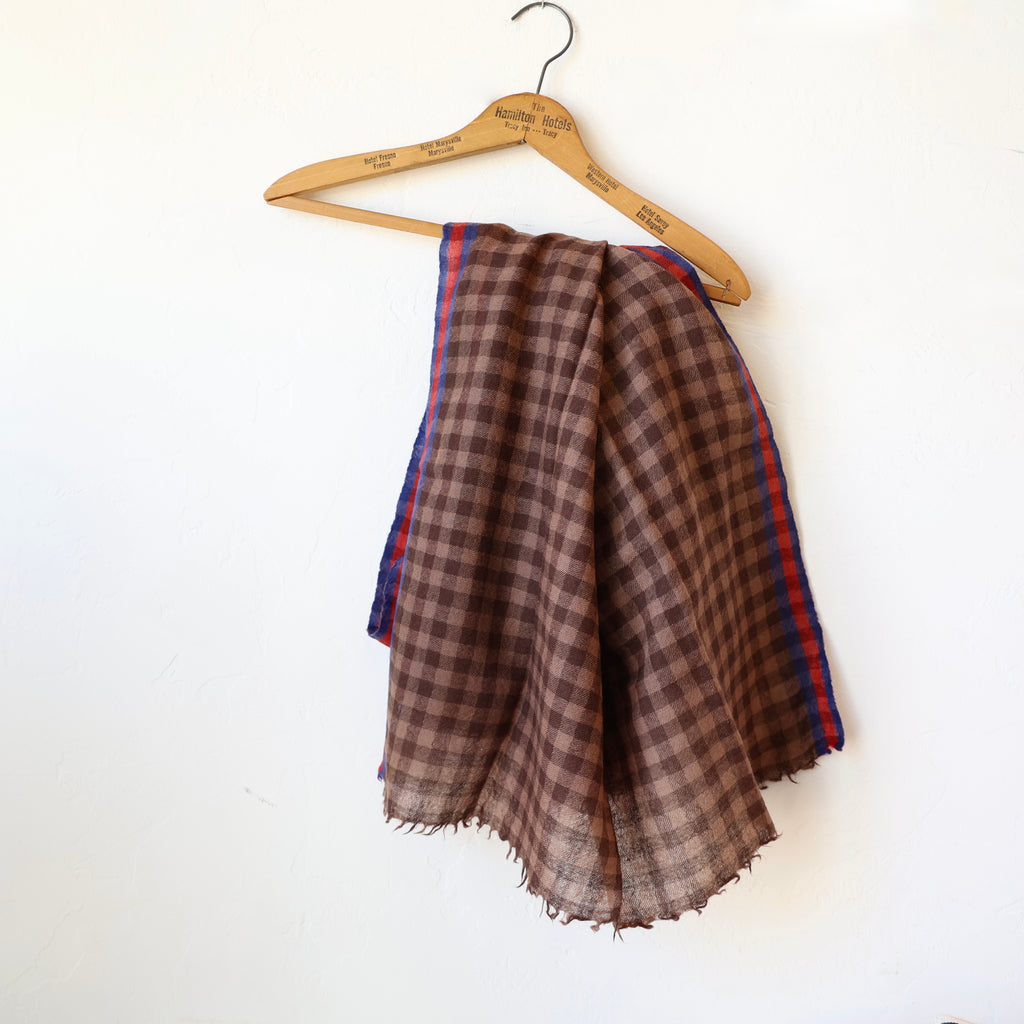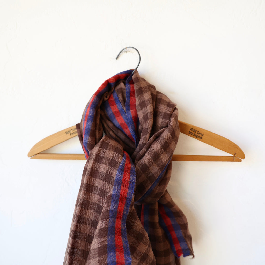 A super soft large scarf in a fantastic brown check with red and blue stripes along the two long edges. It can be worn many different ways. It has a light feel that becomes warmer the more you wrap it.