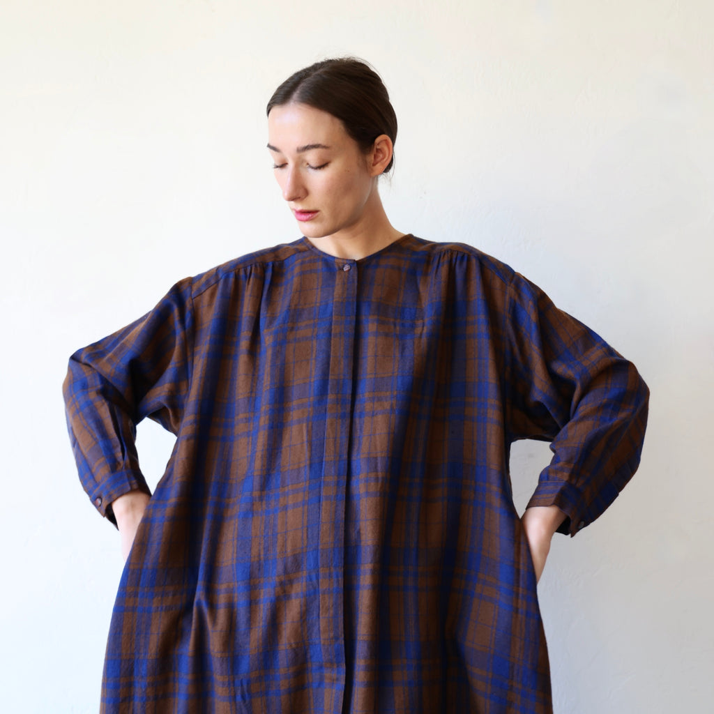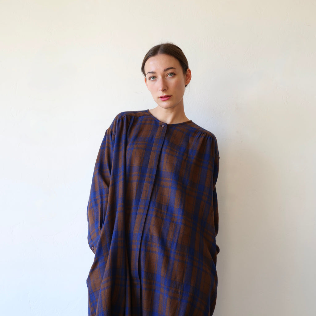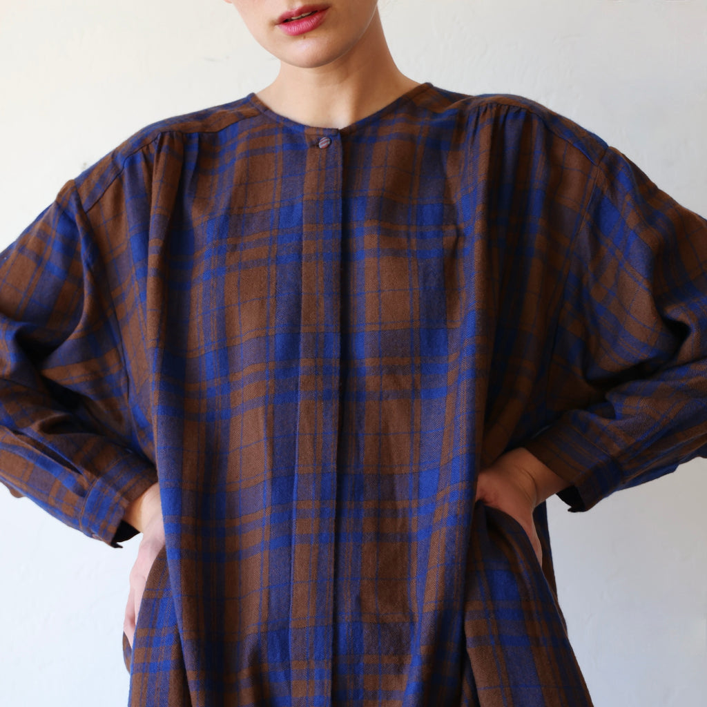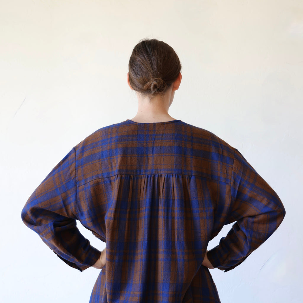 A beautiful dress made of a super soft merino wool with a brown and blue plaid pattern. This has a visible button closure at the neckline with hidden buttons down the front. There are also button closures at the sleeve cuffs. The length hits around the upper to mid calf. It has gathering along the yoke at the back and an oversize fit in the body. The weight of the wool is on the lighter side - it's an easy piece to layer for added warmth.