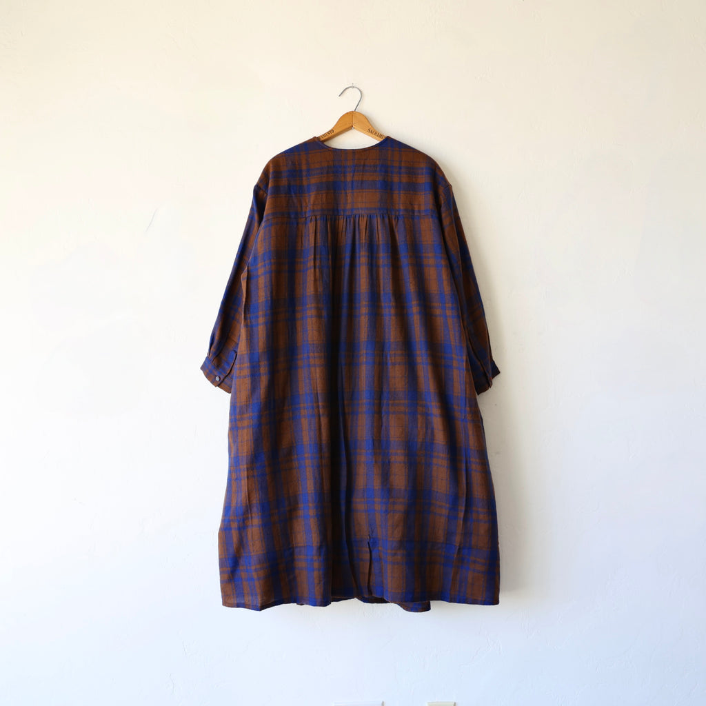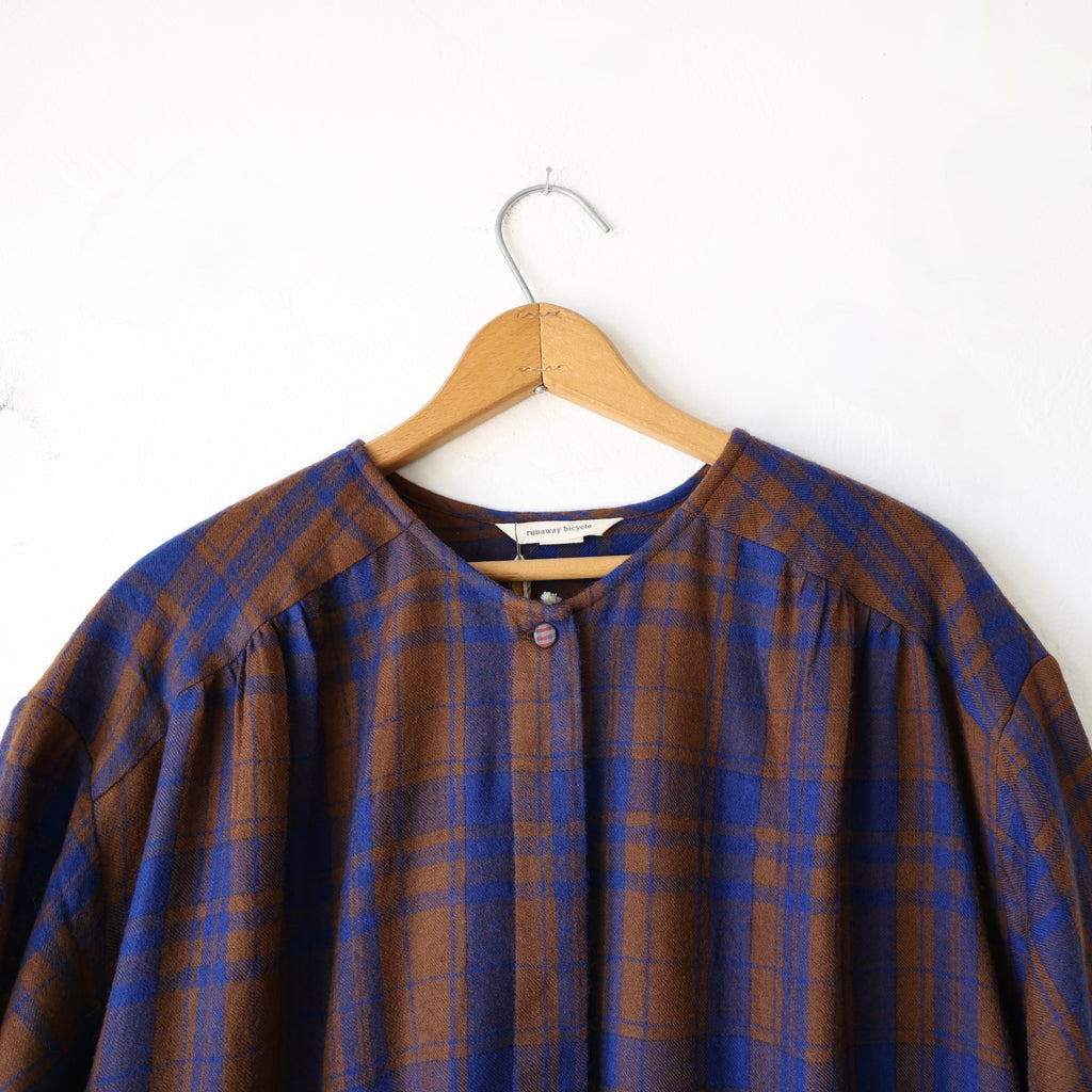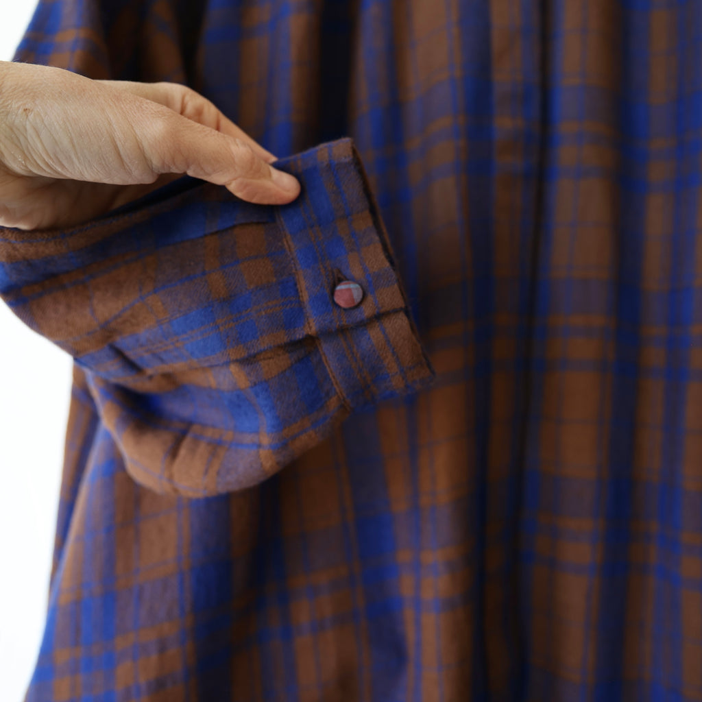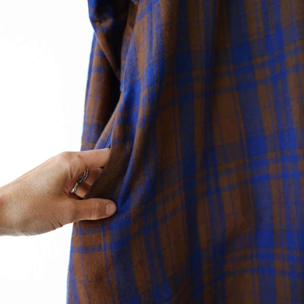 A beautiful dress made of a super soft merino wool with a brown and blue plaid pattern. This has a visible button closure at the neckline with hidden buttons down the front. There are also button closures at the sleeve cuffs. The length hits around the upper to mid calf. It has gathering along the yoke at the back and an oversize fit in the body. The weight of the wool is on the lighter side - it's an easy piece to layer for added warmth.