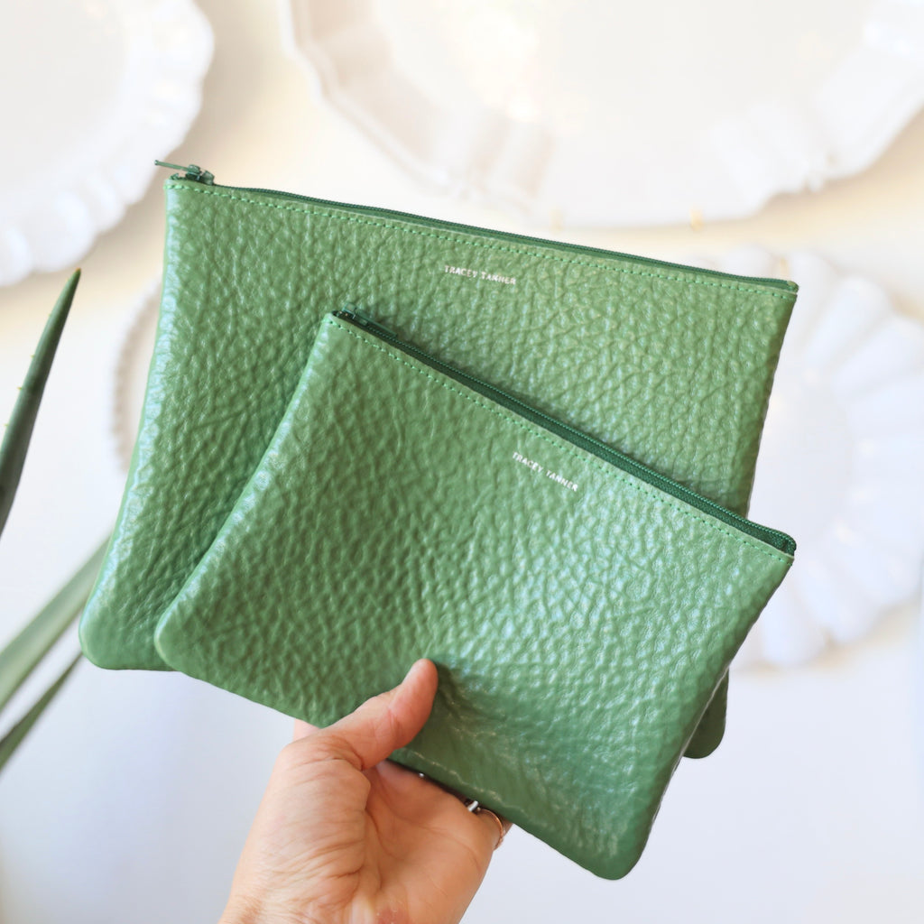 Wonderful leather zip flat pouches in a fantastic cactus green that has a great ripple texture. These are great for using as a clutch for evenings out or for organizing things in a larger bag.