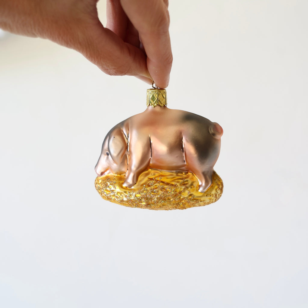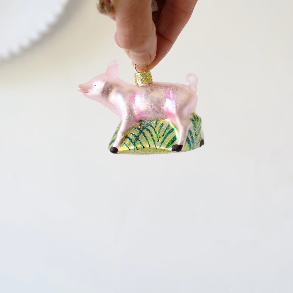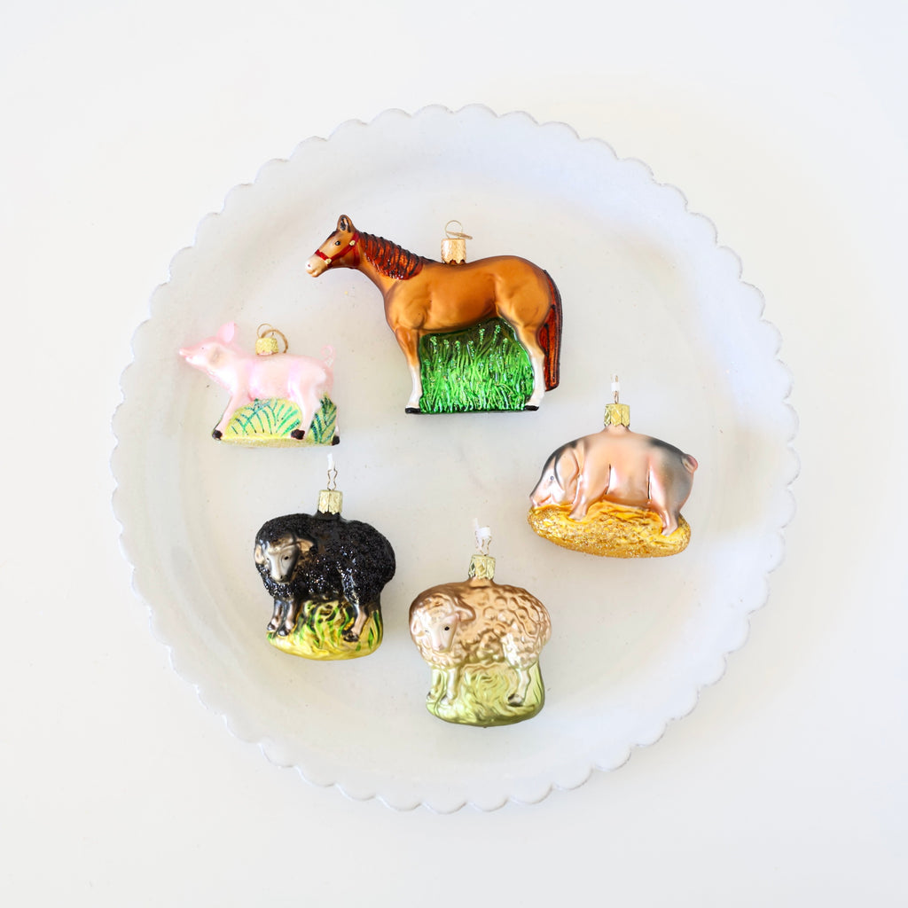 Beautiful farmyard animal ornaments. Each one has hand painting and hand glittering. A horse, sweet sheep and pigs. There are two different pigs - one that is a bit larger and in hay, the other is smaller and walking in green grass. s