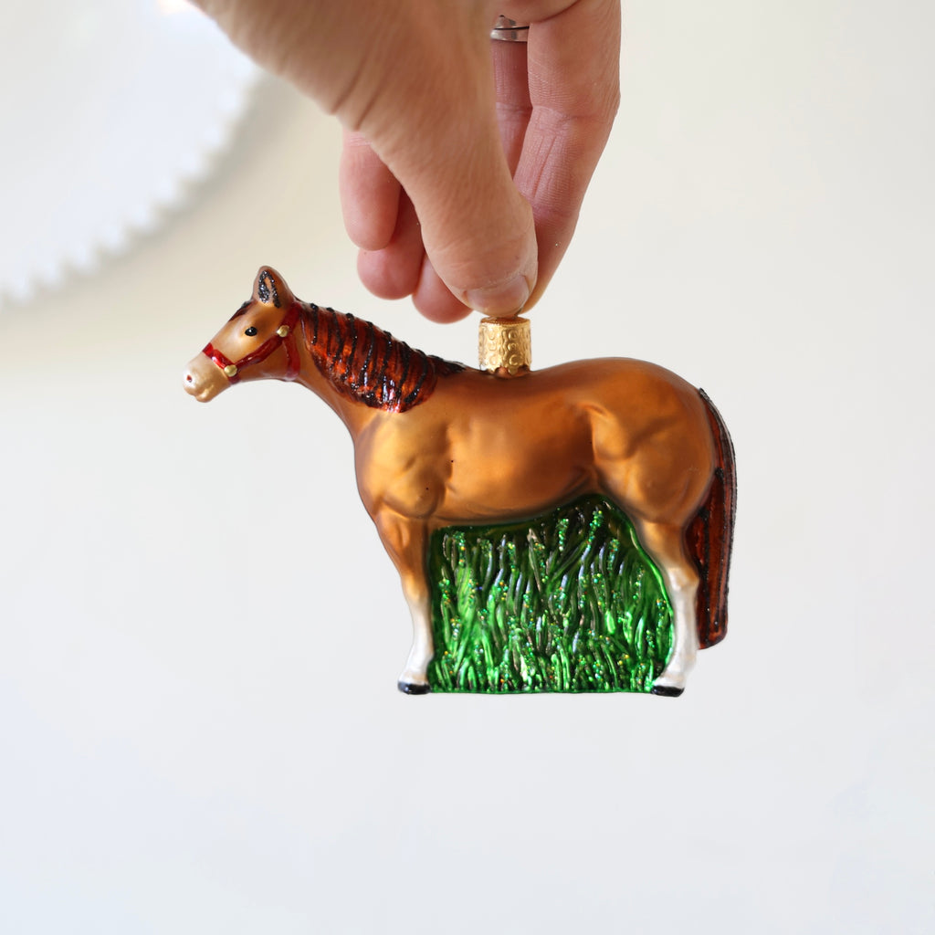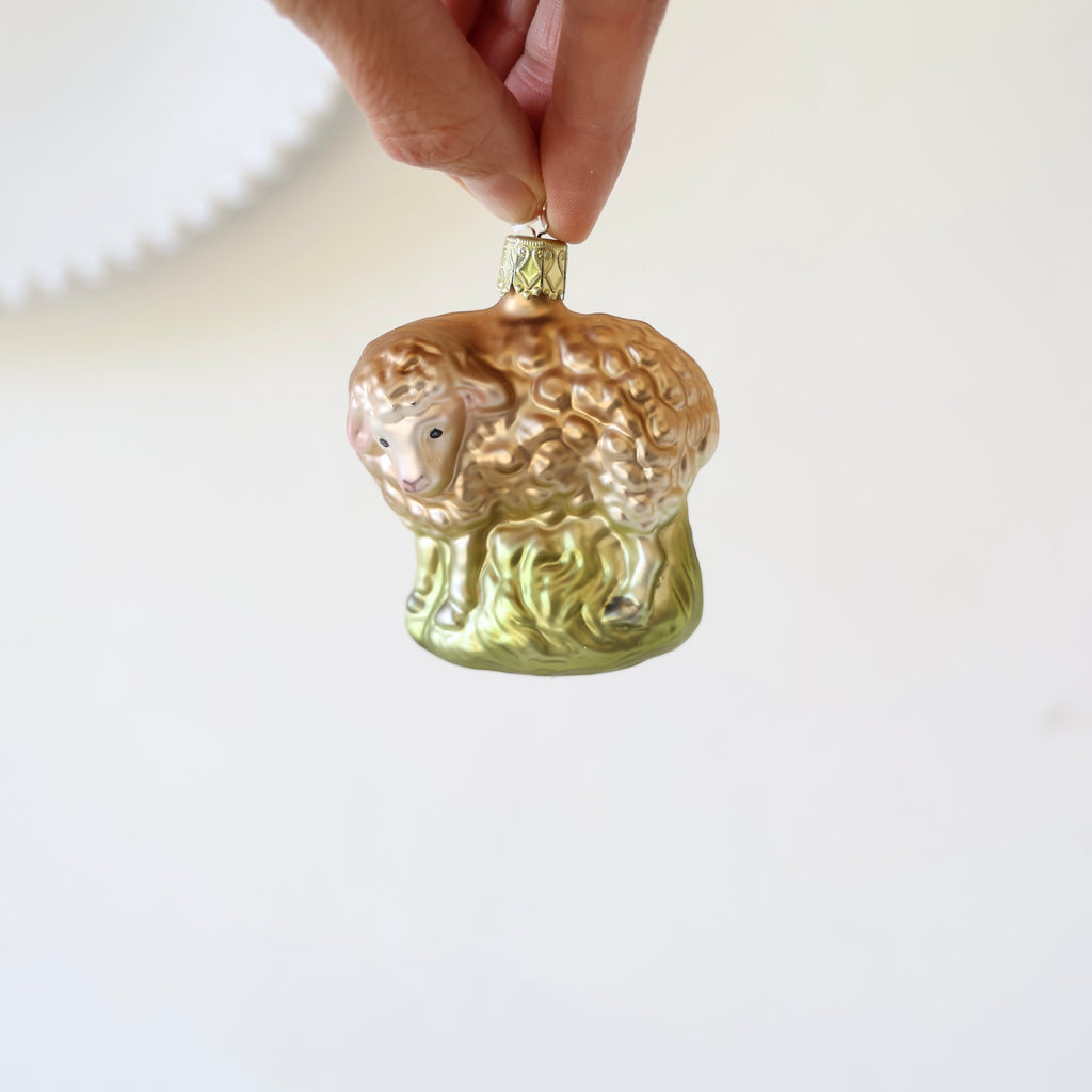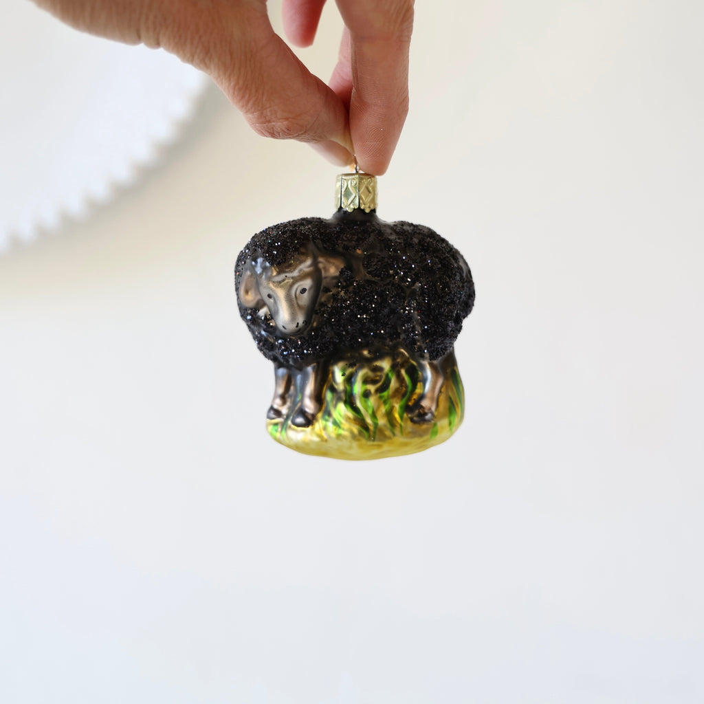 Beautiful farmyard animal ornaments. Each one has hand painting and hand glittering. A horse, sweet sheep and pigs. There are two different pigs - one that is a bit larger and in hay, the other is smaller and walking in green grass. s