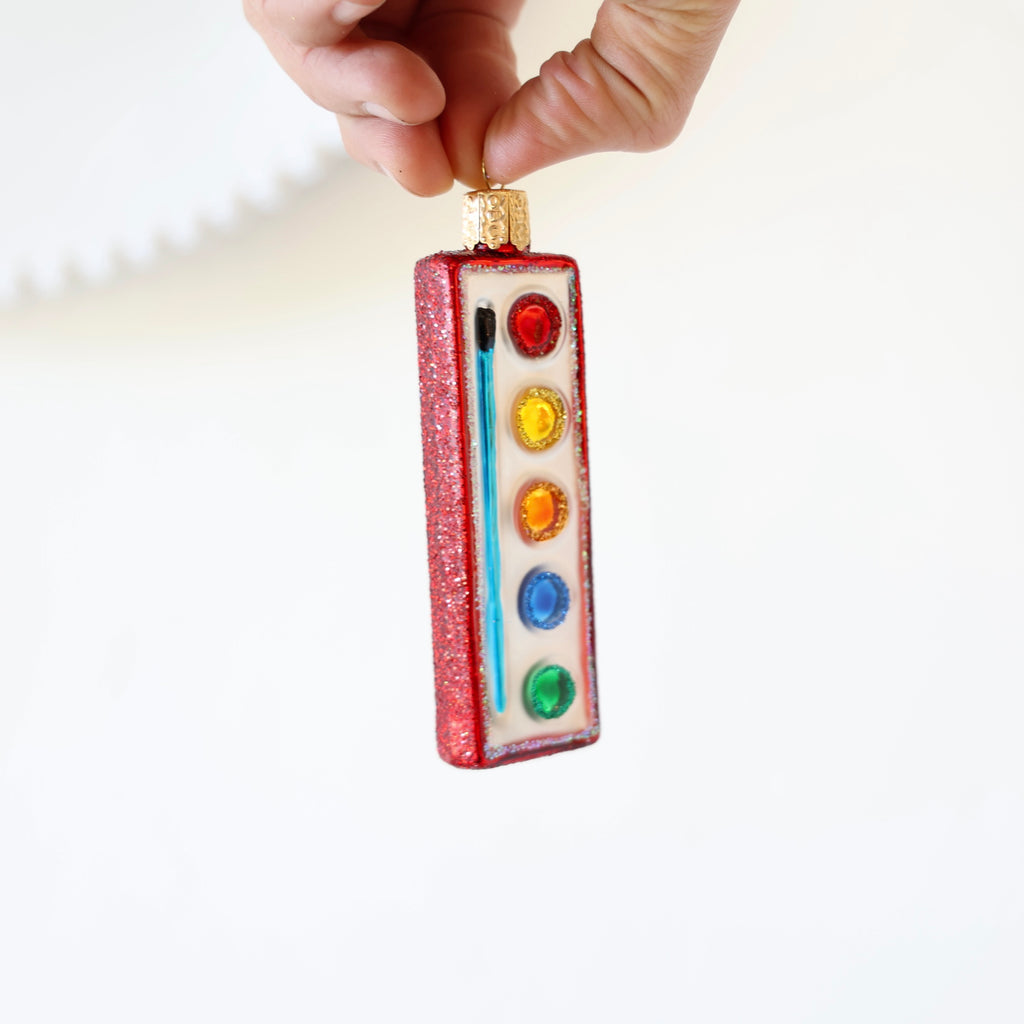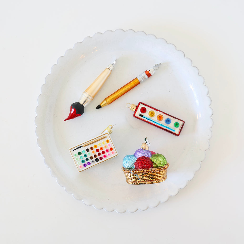These are beautiful and make great gifts for the artist in your life! Choose from two different watercolor sets, a paint brush, a pencil and a knitting basket. Each one has hand painting and/or hand glittering details.