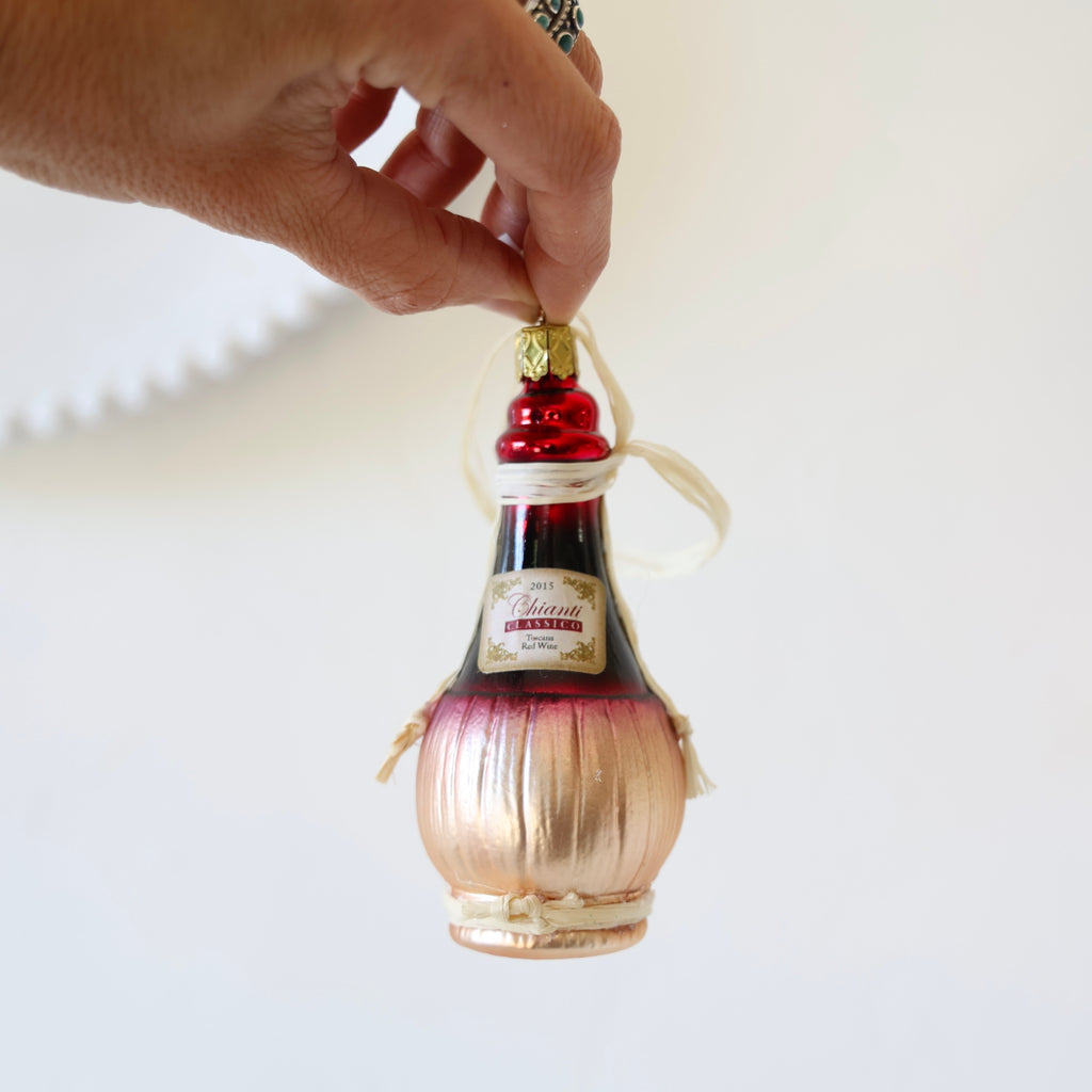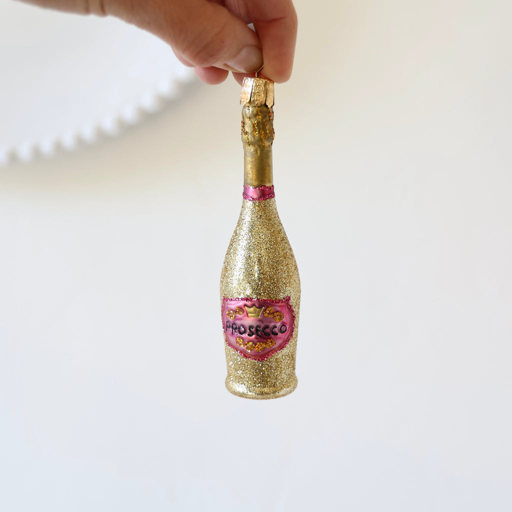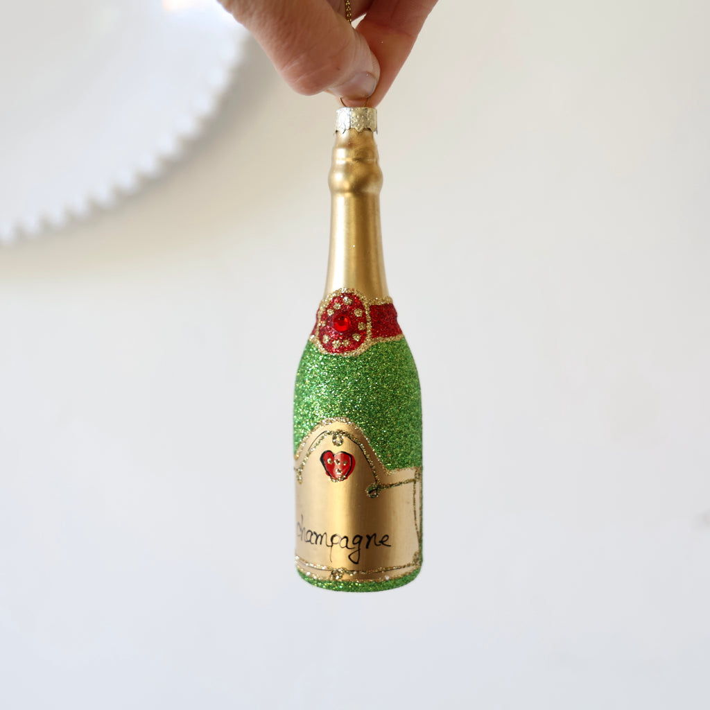 So fun and celebratory! Blown glass ornaments in the form of chianti, a sparkly prosecco, champagne and a cigar! These all have hand painted and/or glittered details.