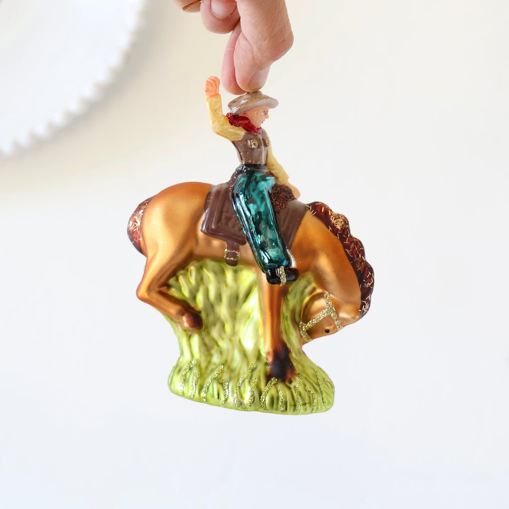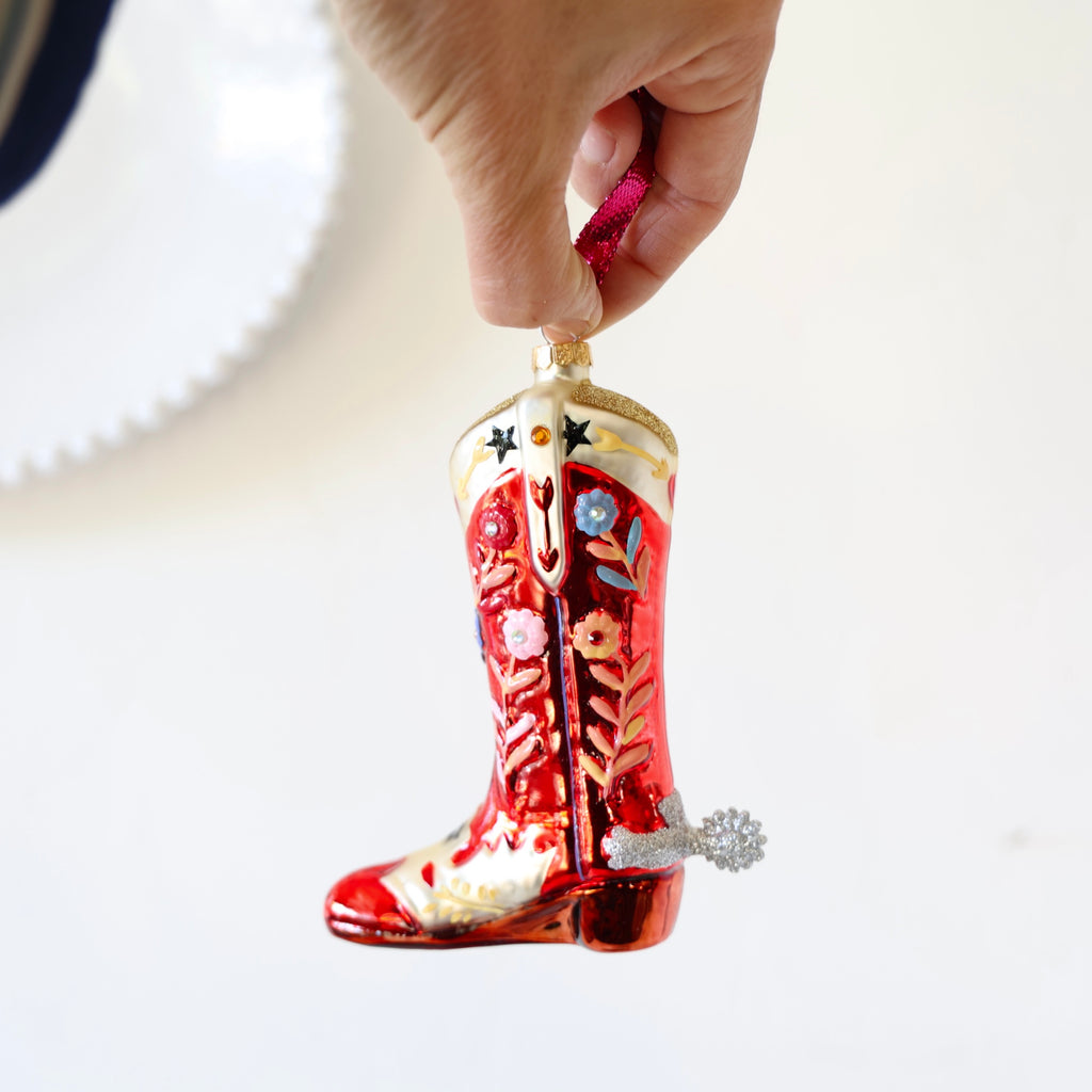 Blown Glass Ornaments - Giddyup! - 3 Options $ 30.00 Description We love these fun wild west ornaments! Choose from a cowboy, cowgirl or red cowboy boot. The boot is complete with a sparkle spur! They all have hand glittered details. Each ornament sold individually. style cowboy - $ 32.00 cowgirl - $ 30.00 cowboy boot - $ 32.00