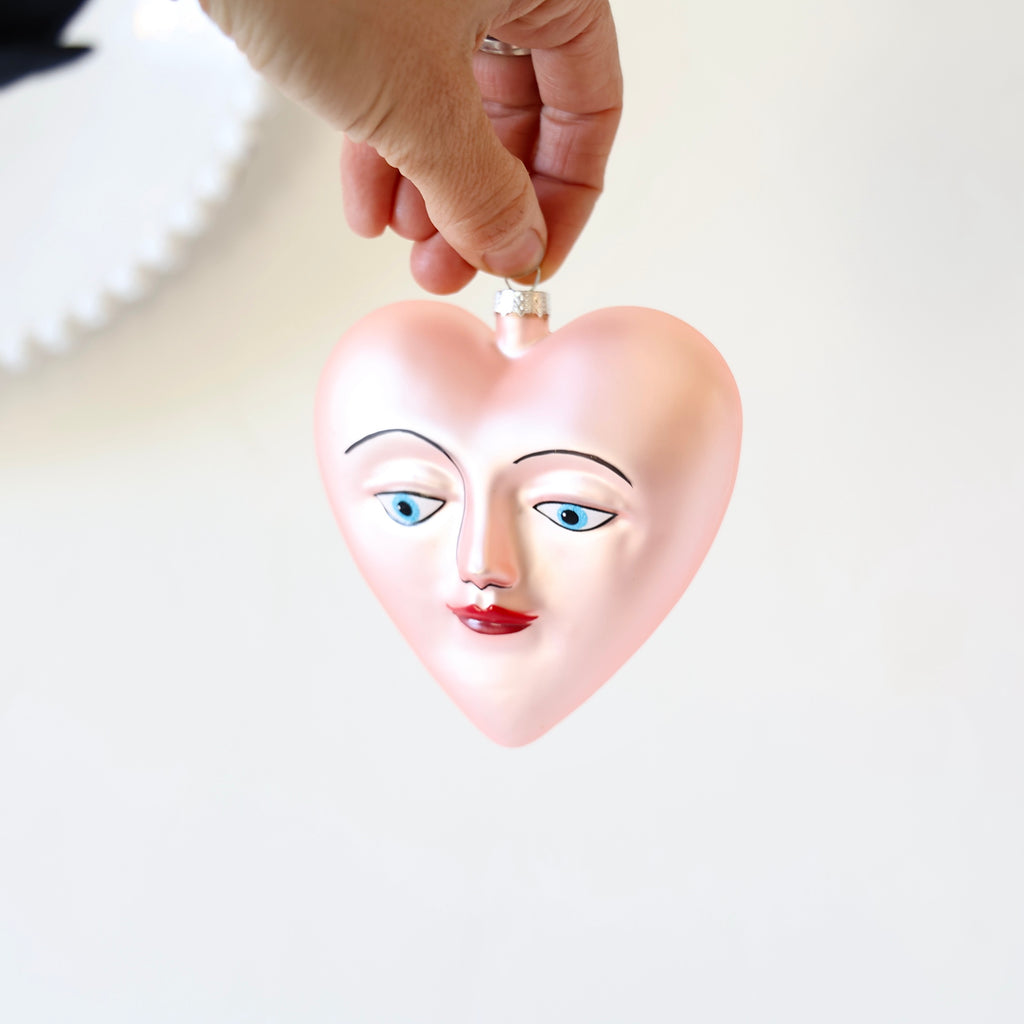 Beautiful blown glass ornaments in the theme of love! From a happy heart face to a lover's eye brooch... these are all fun and sweet! Each ornament has hand painted and/or hand glittered details.
