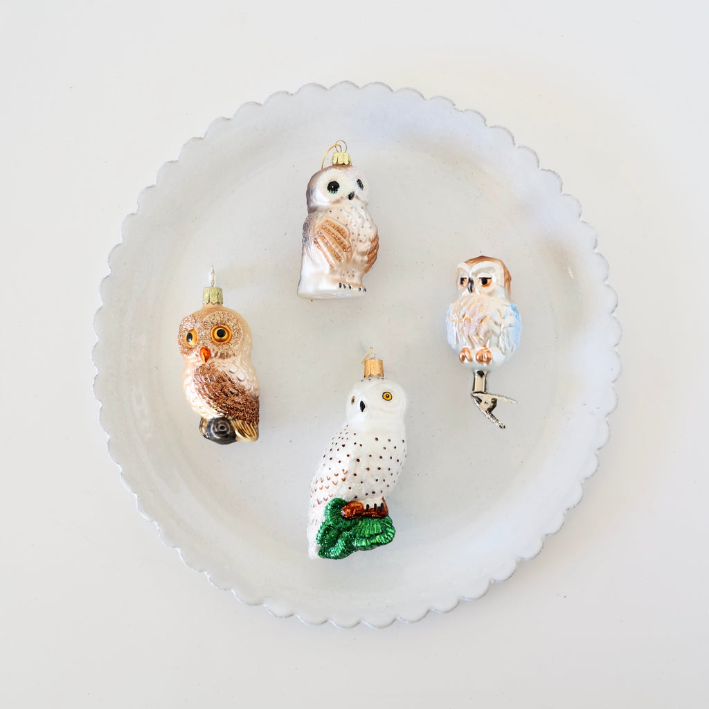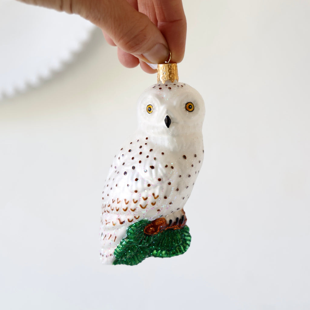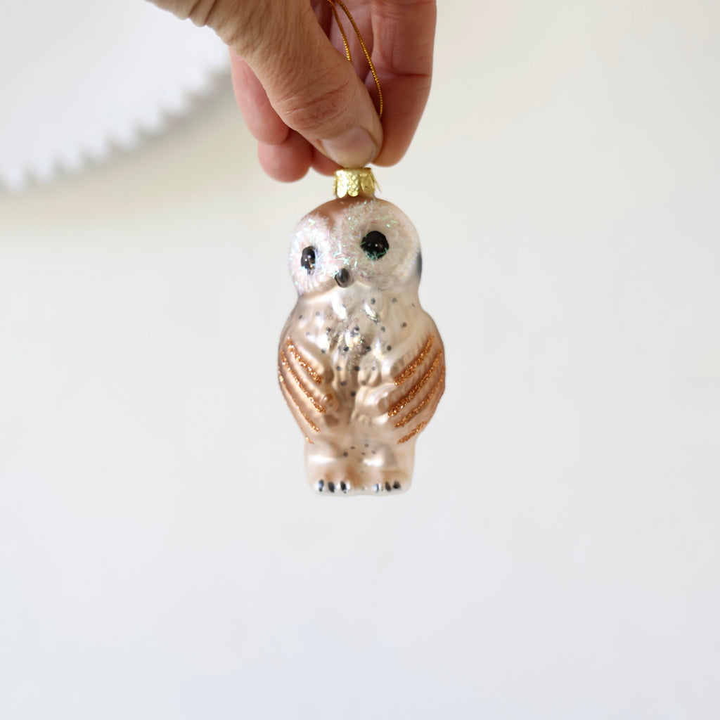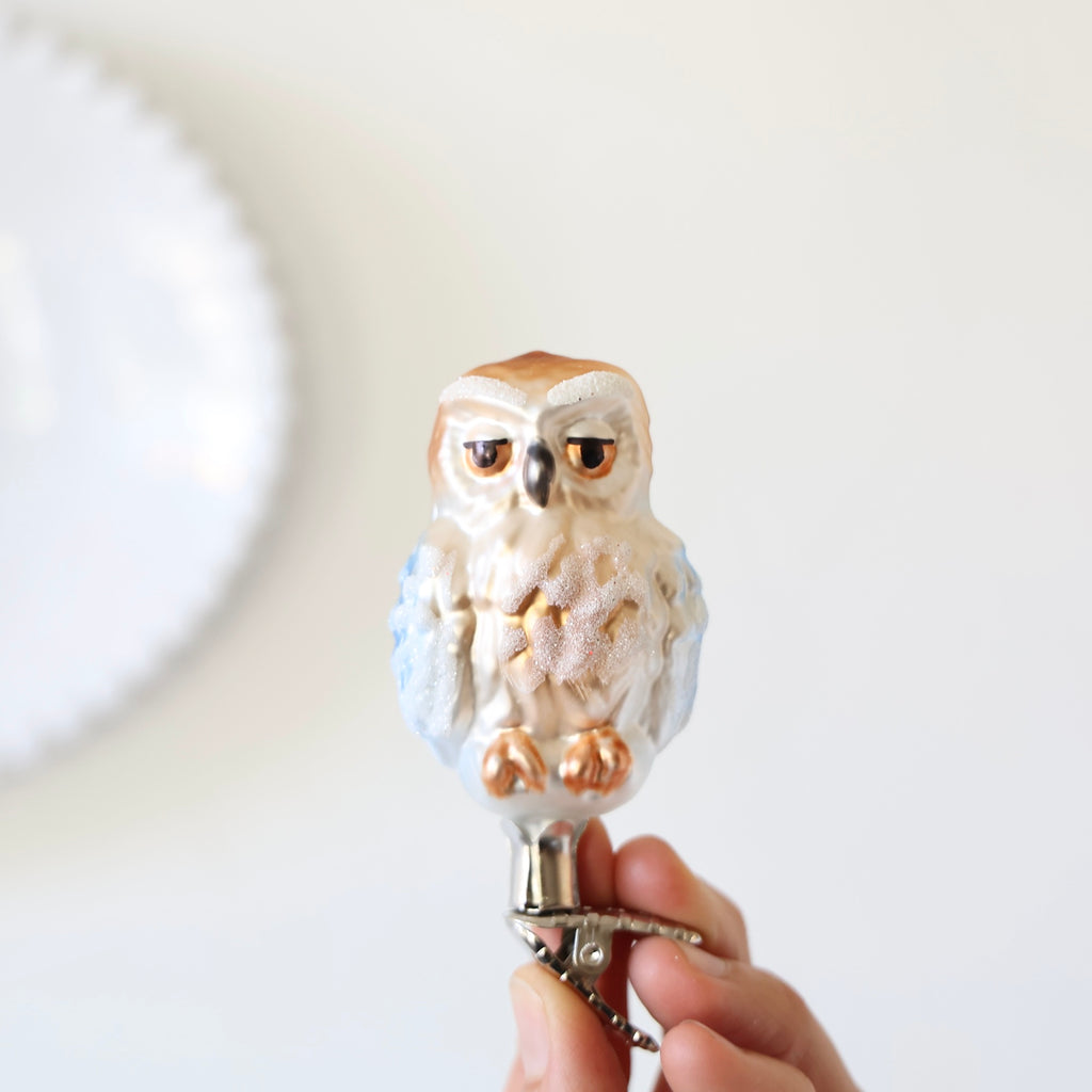 Blown Glass Ornaments - Owls - 4 Options $ 21.00 Description Beautiful blown glass ornaments in a variety of majestic owls. They have wonderful expressions. There's one clip-on and the others hang. Each one has hand painting and hand glittering. Each ornament sold individually style brown owl with large brown eyes - $ 43.00 cream/brown owl with white glitter surrounding the eyes - $ 21.00 large snowy owl - $ 30.00 cream/brown clip-on owl - $ 36.00