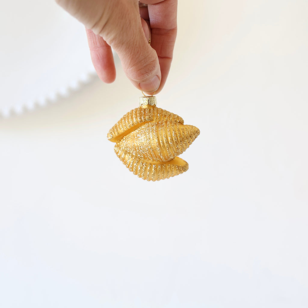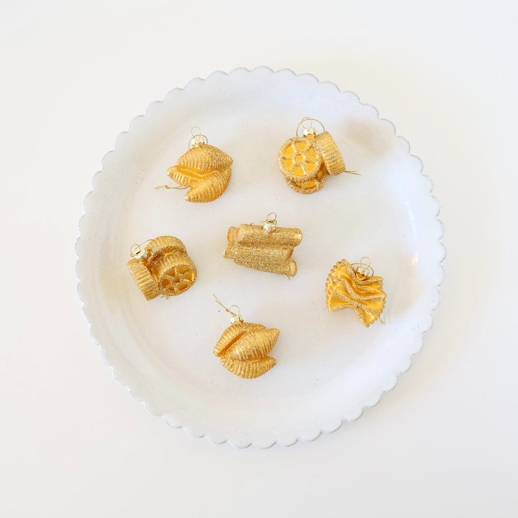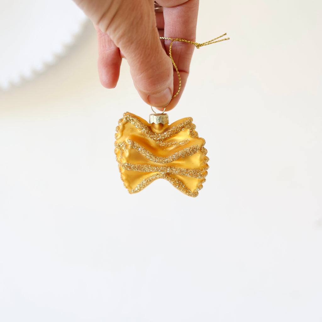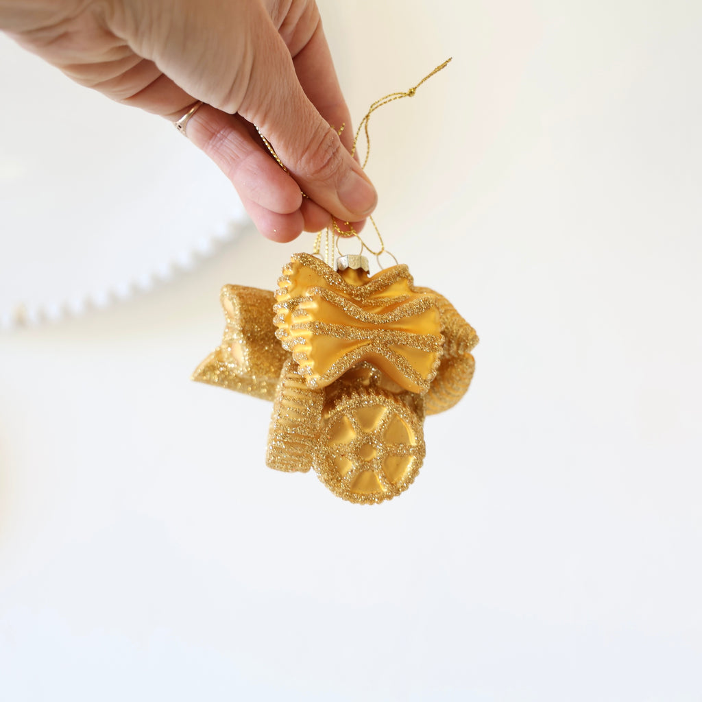 These are so great! Blown glass ornaments in the shapes of different pastas. They are golden in color and hand detailed with gold glitter. We think one or two of these tied on the top of a cookbook gift would be so sweet. They're also great to give as a whole pasta set - one of each!