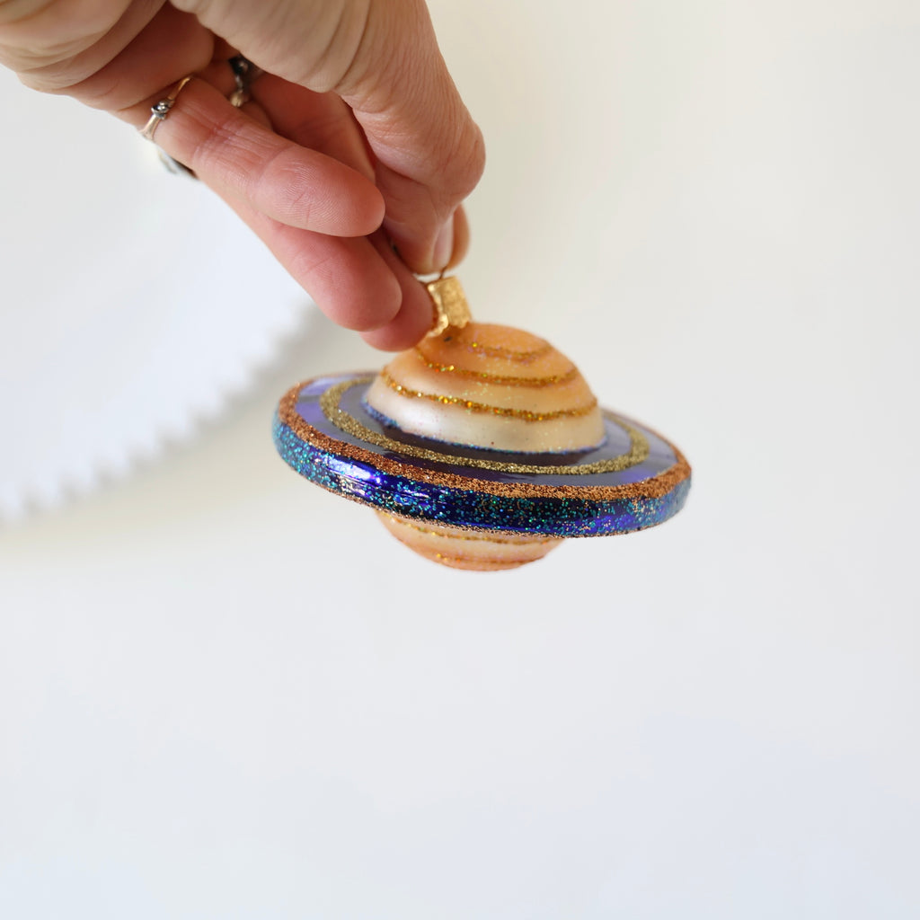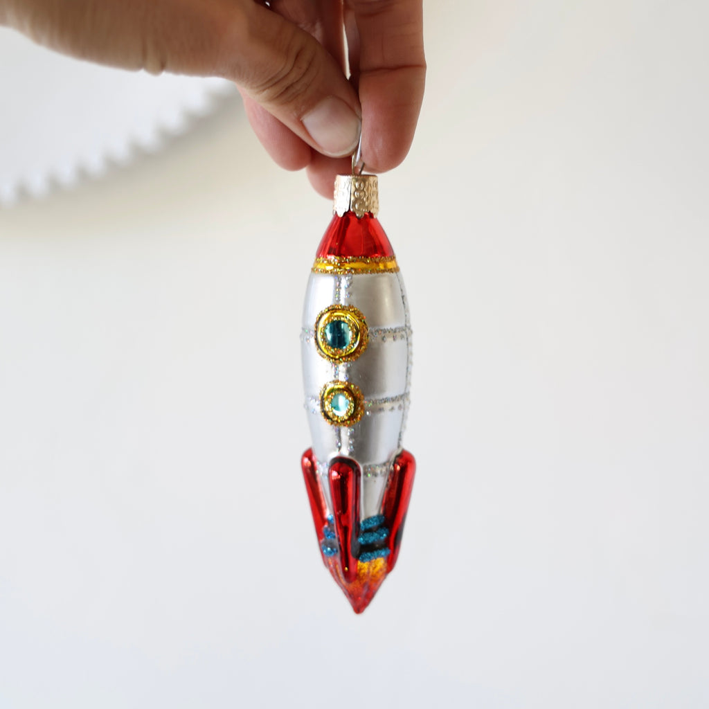 Blown Glass Ornaments - Saturn & Rocketship $ 30.00 Description These are such fun ornaments! Glittery rocketships and Saturn! These have hand painted and hand glittered details. Each ornament sold individually style rocketship - $ 30.00 saturn - $ 30.00