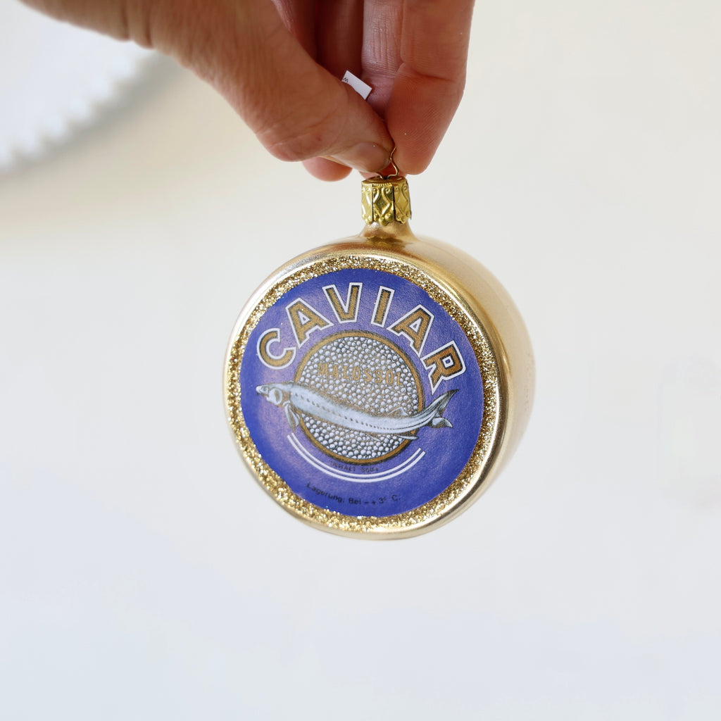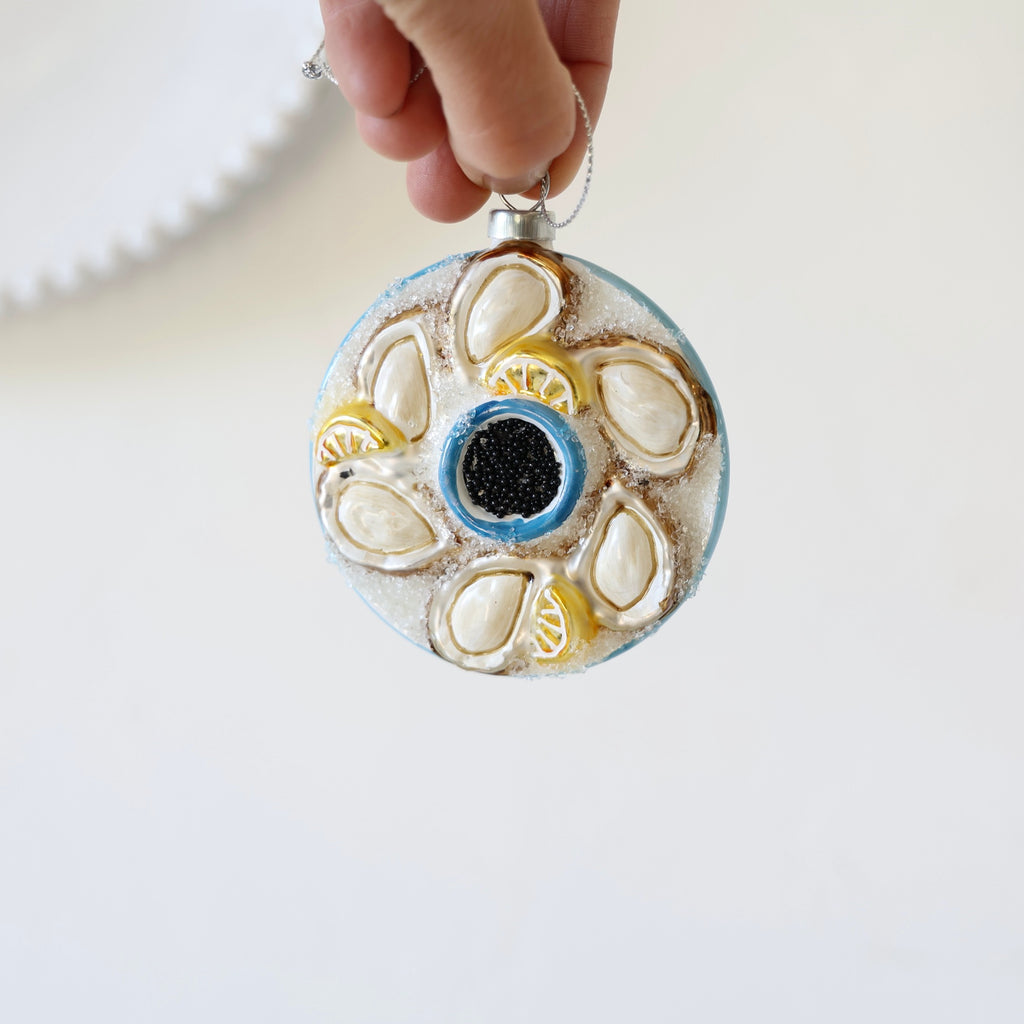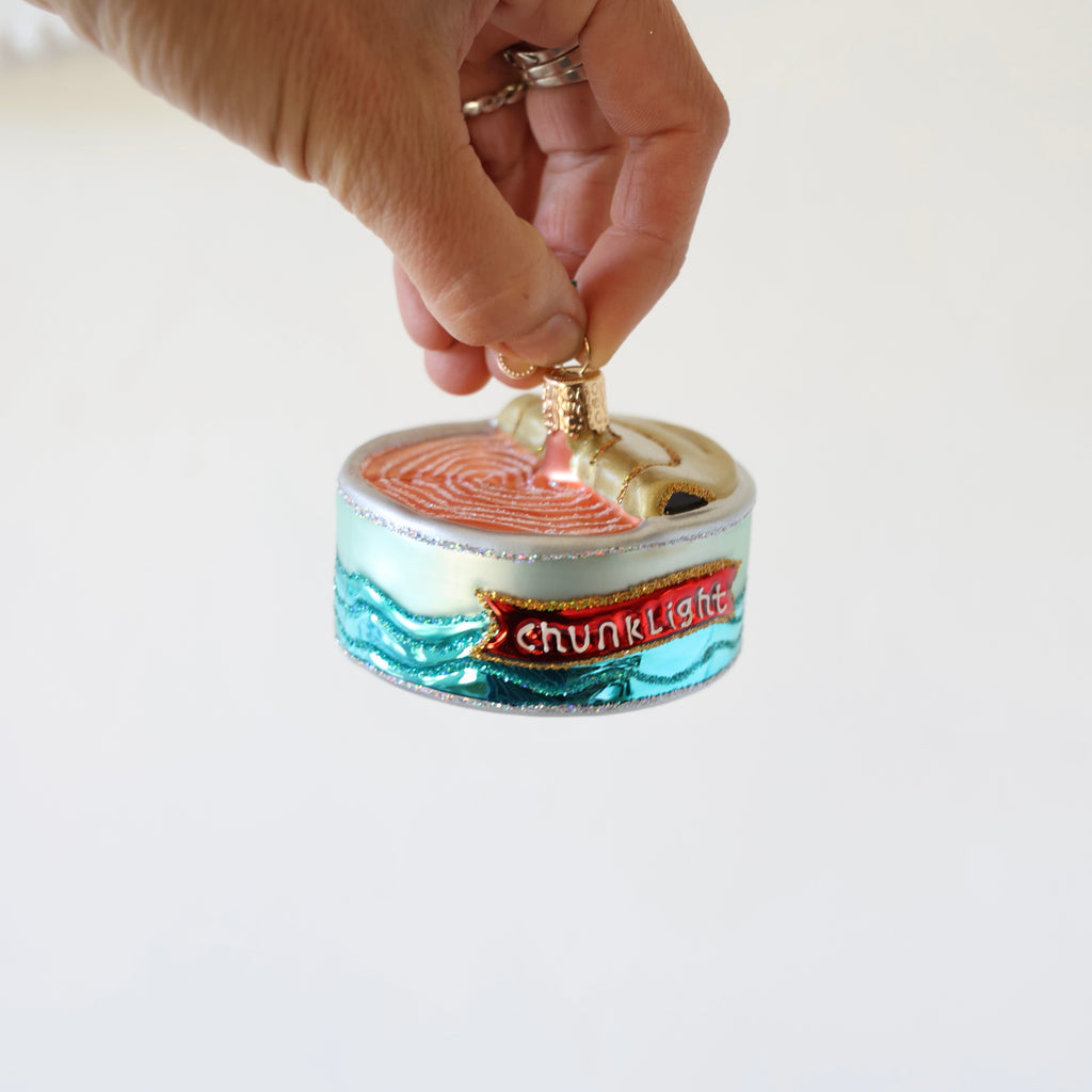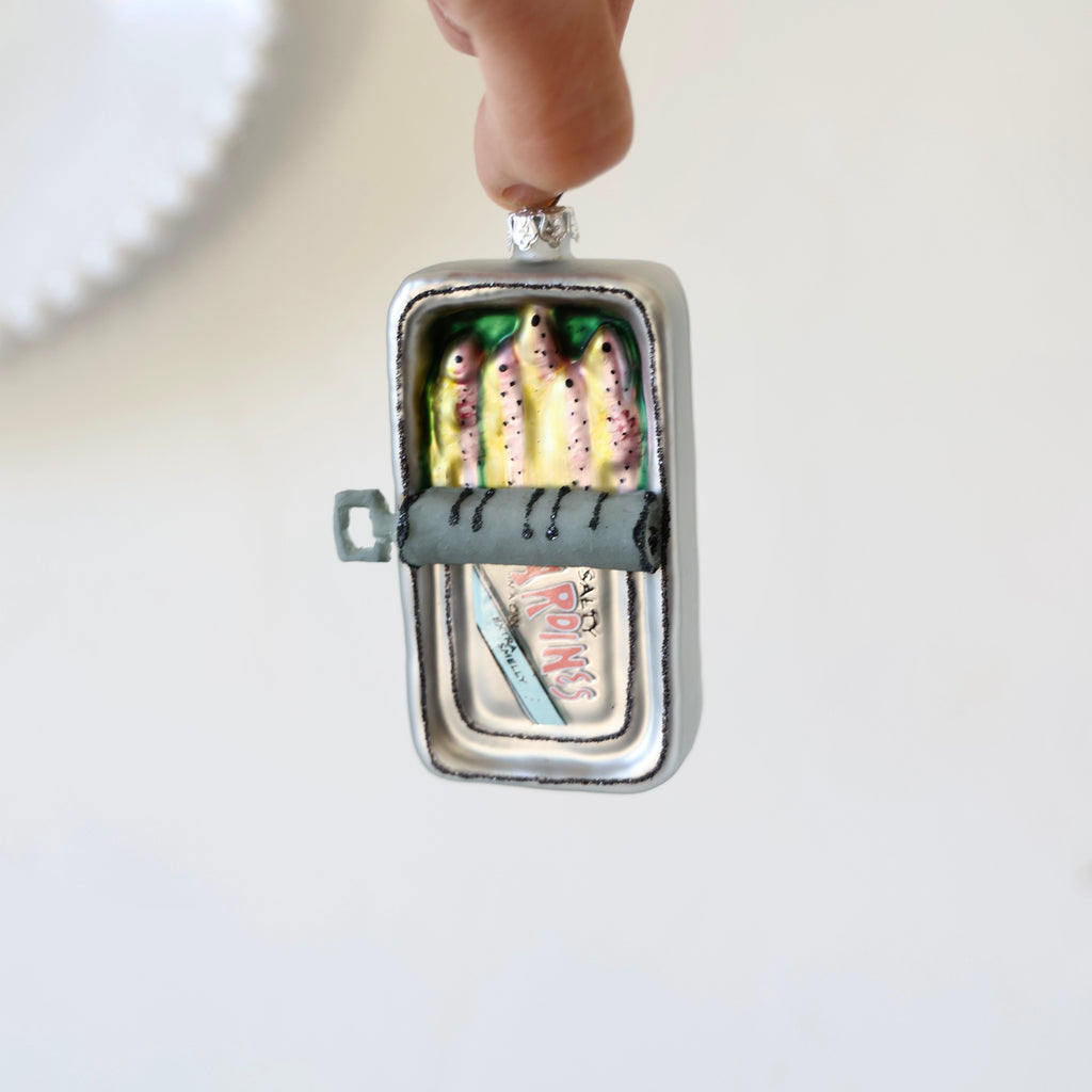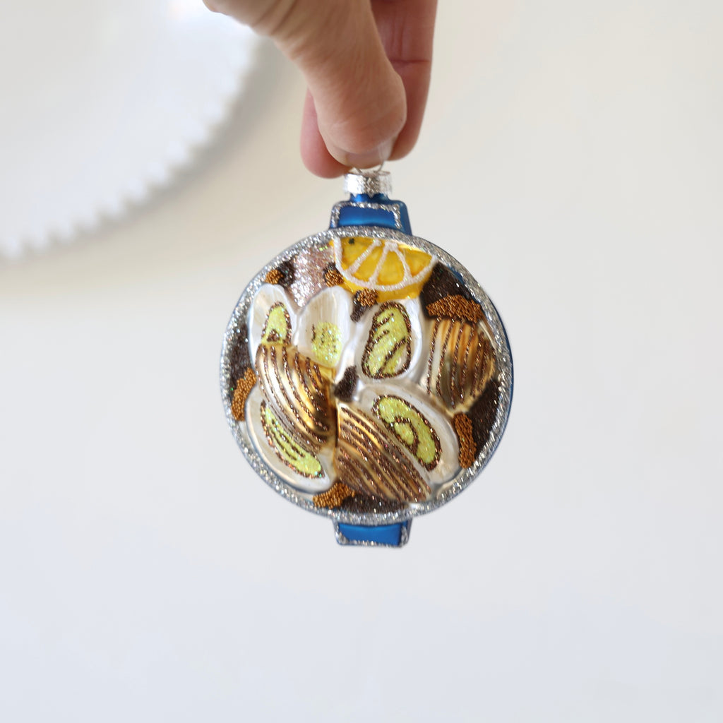 A continuation of our fun food ornaments, this batch includes all the beautiful seafood options. Choose from different canned fish to oysters, and a pot of fruit de mer! Each ornament has hand painted and glittered details.