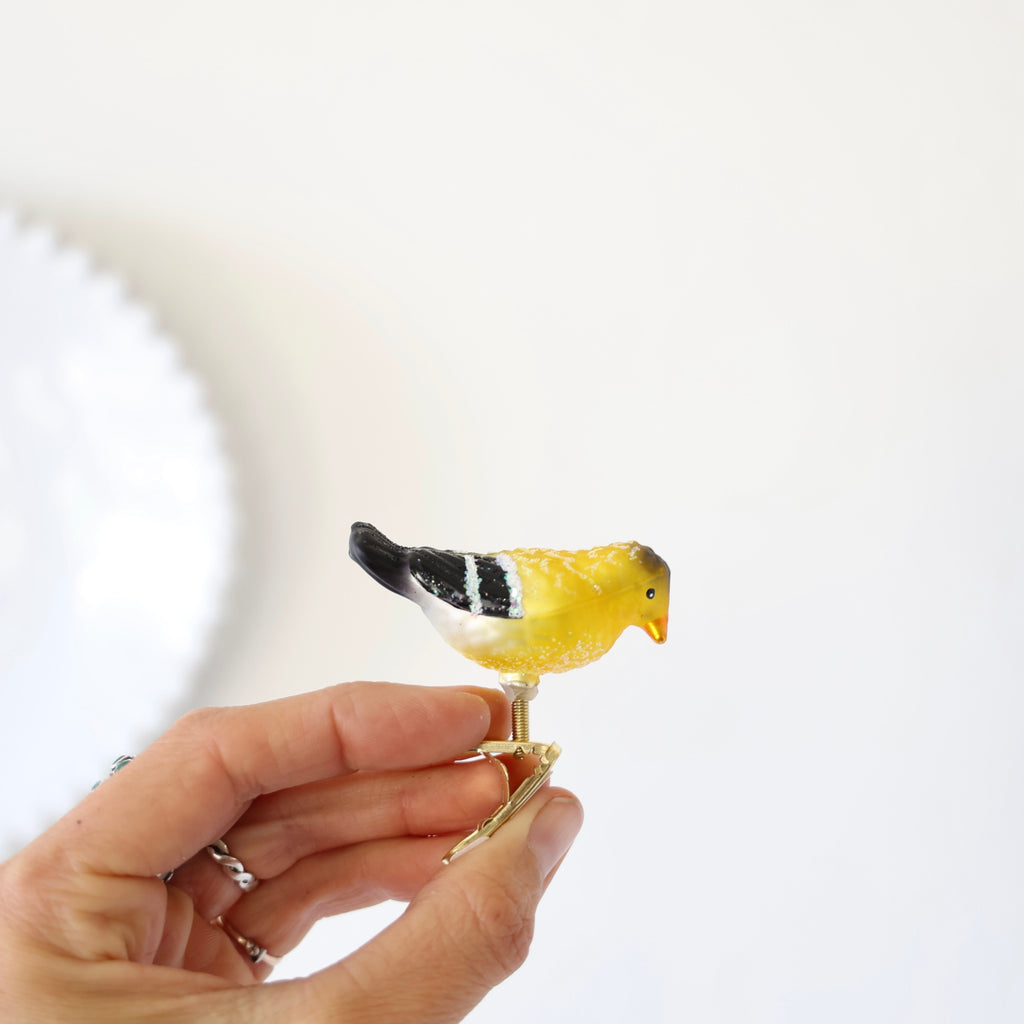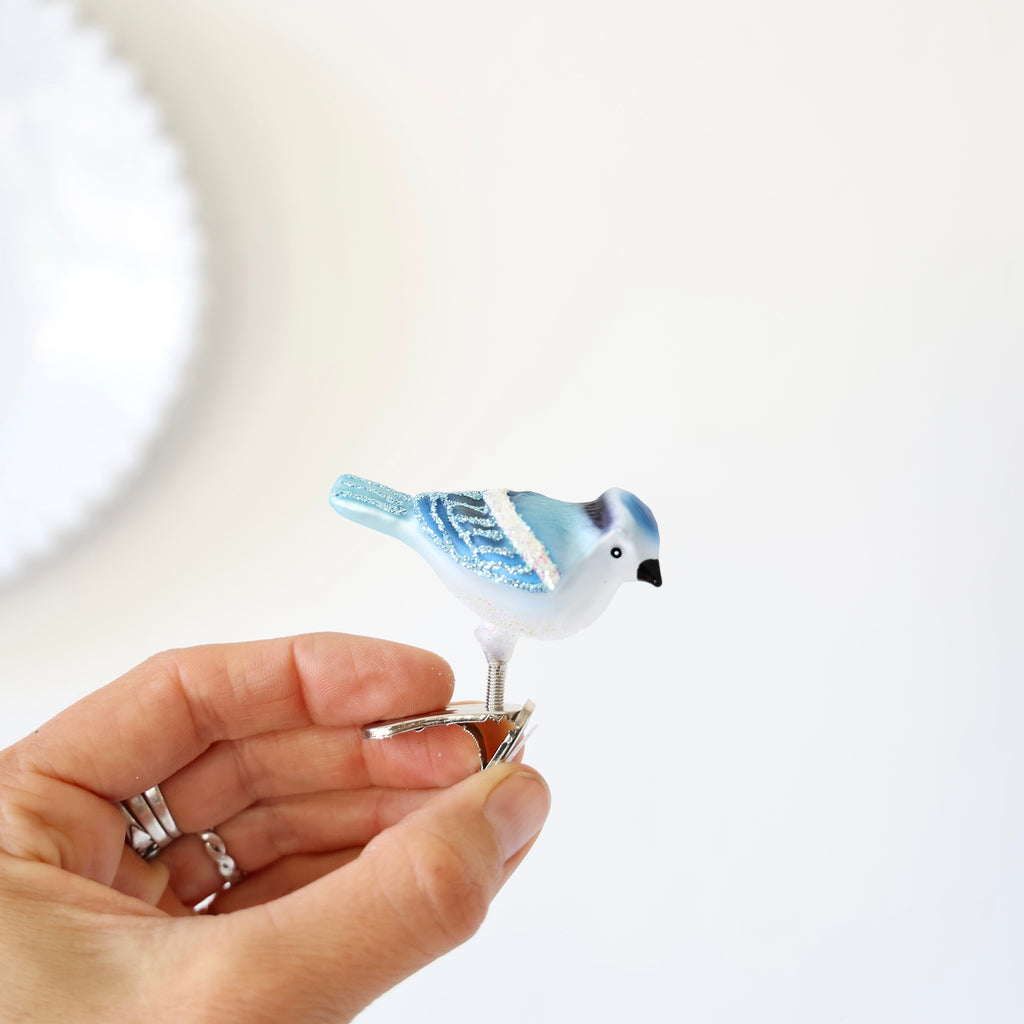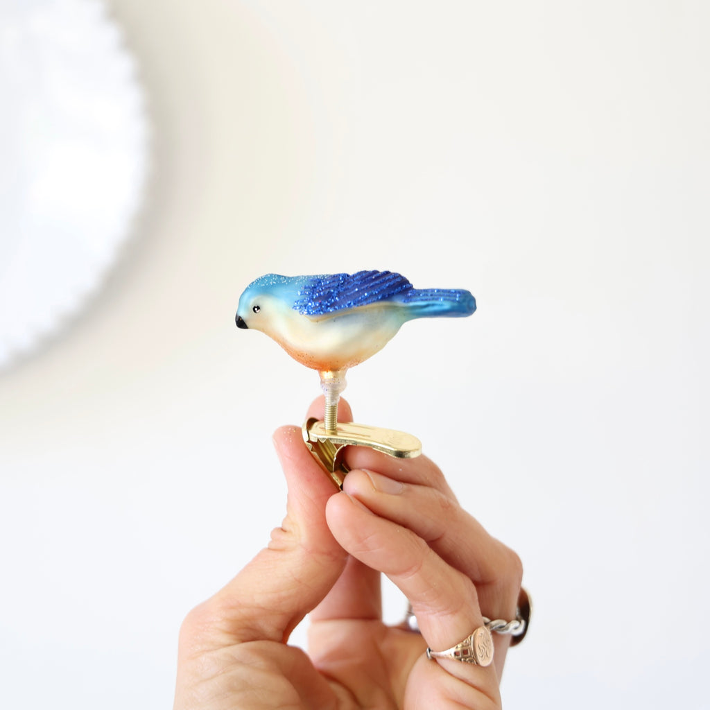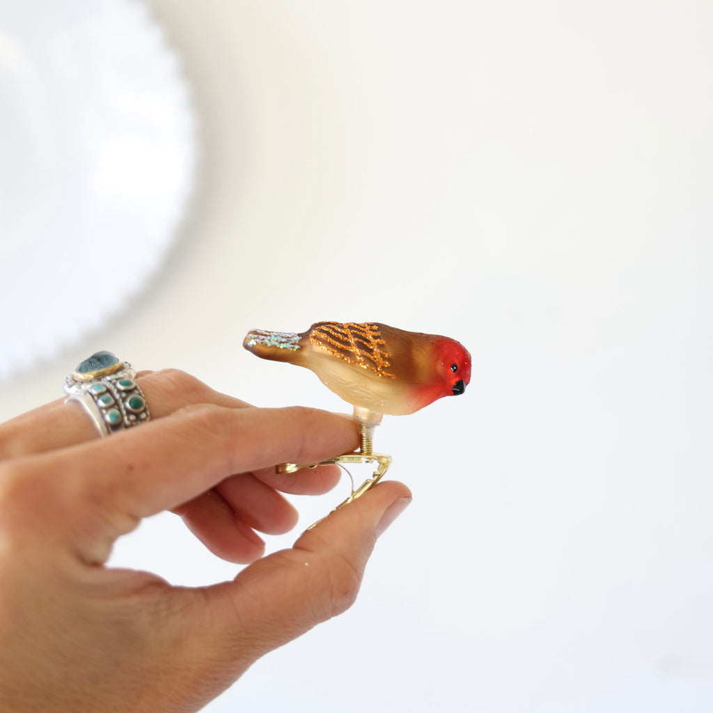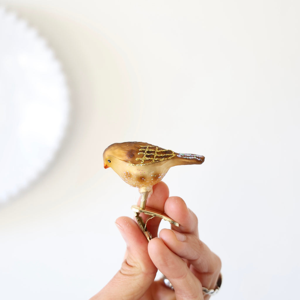 Wonderful small songbird clip-ons. These are so fun to put all over the tree. It's hard to find small clip-ons for the higher branches so we were very excited to find these sweet birds! Each ornament has hand glittered details.