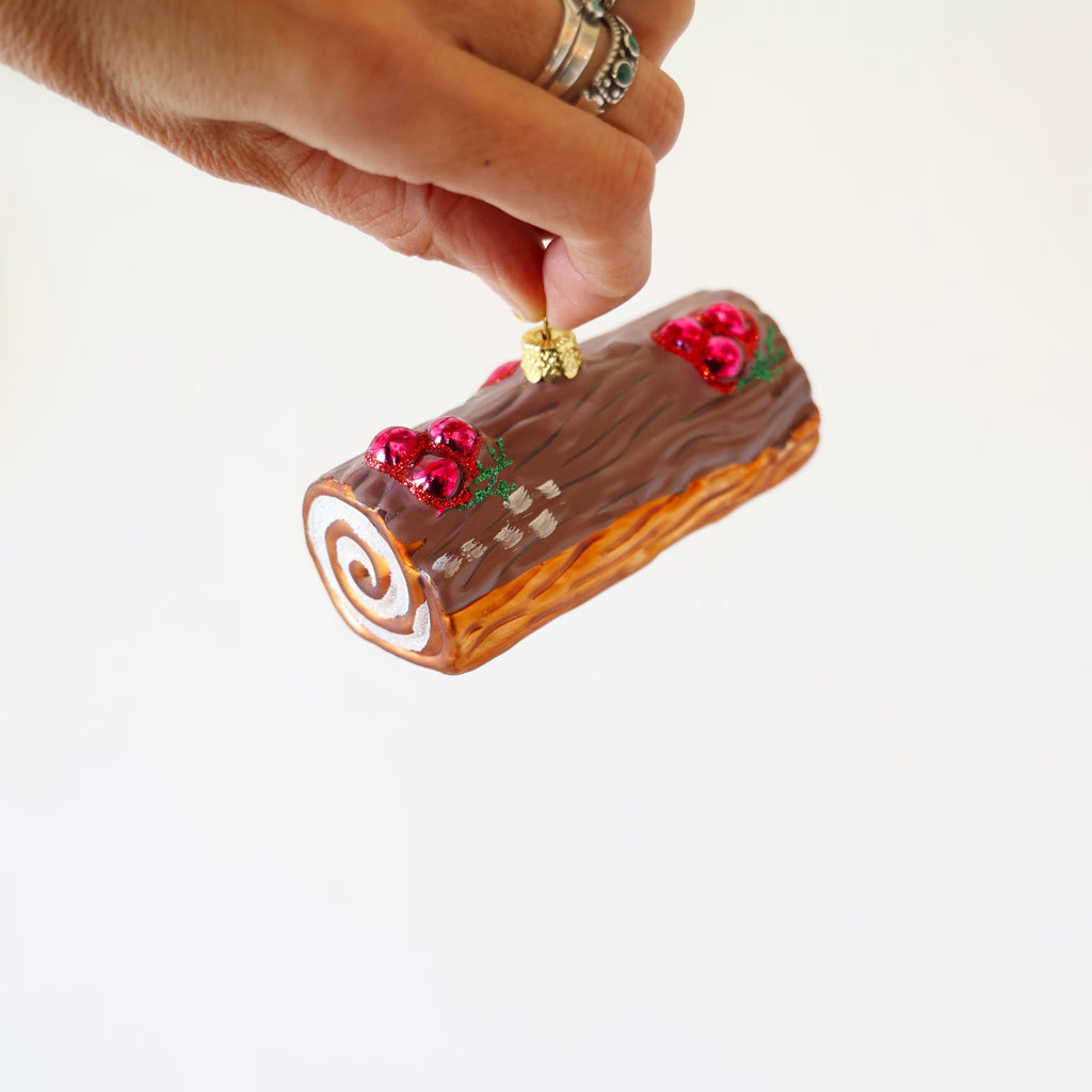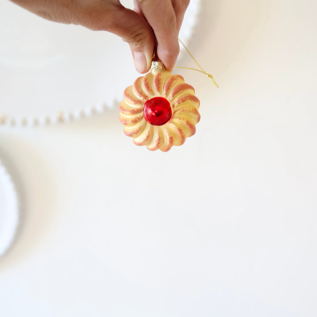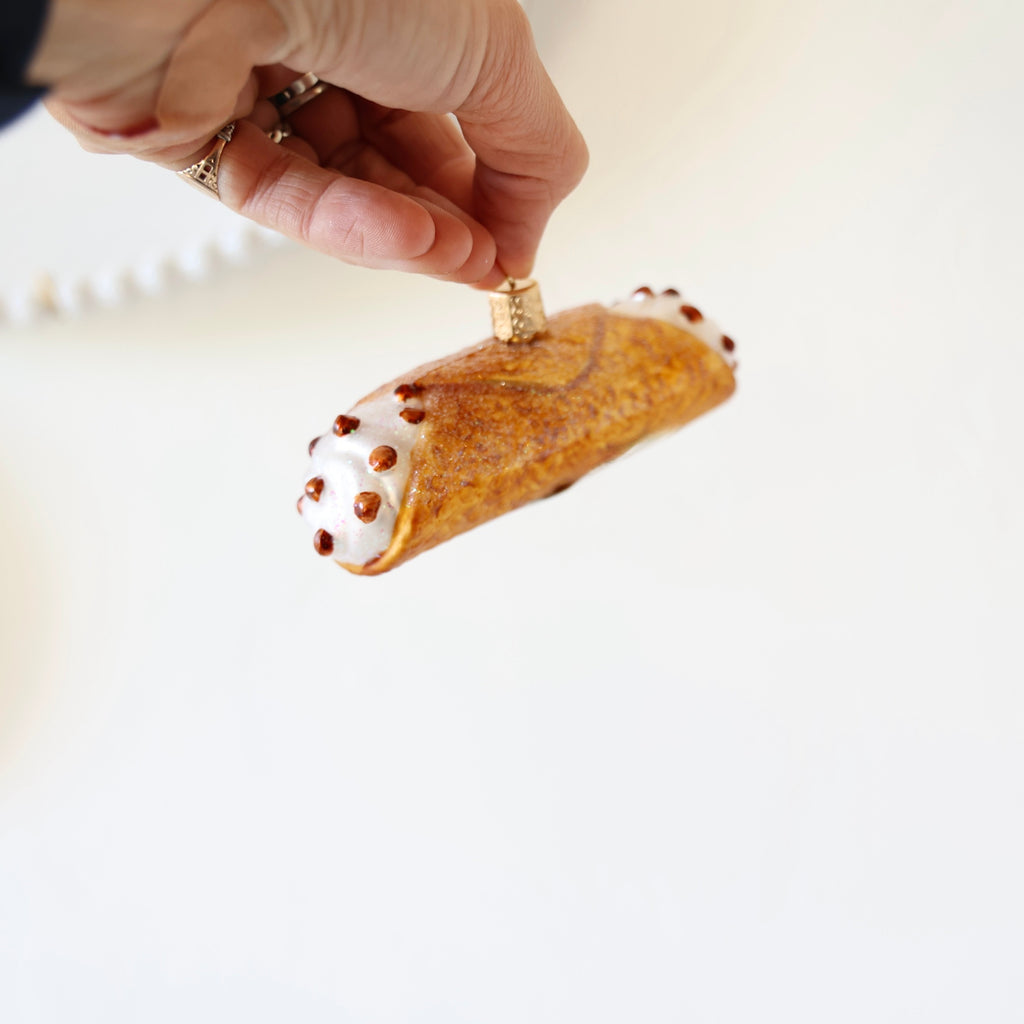Blown Glass Ornaments - Sweet Treats #1 - 7 Options $ 15.00 Description These look good enough to eat! Beautiful sweet treat ornaments, from a cannoli to a slice of cake with a cherry on top! They all have hand painted and/or hand glittered details. Each ornament sold individually style yule log - $ 22.00 linzer cookie - $ 21.00 italian spritz cookie with red center - $ 15.00 cannoli - $ 30.00 slice of cake - $ 36.00 petit four - $ 29.00 madeleine - $ 20.00
