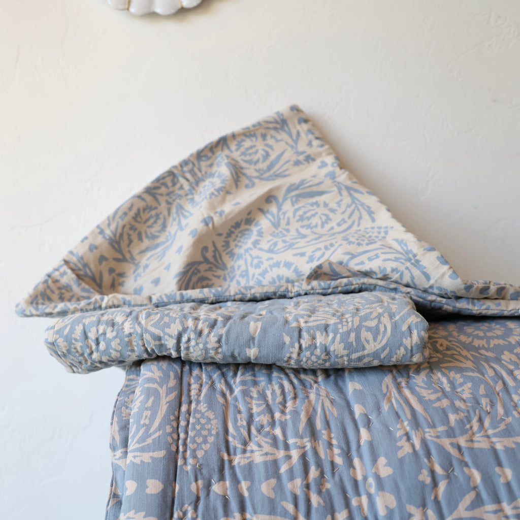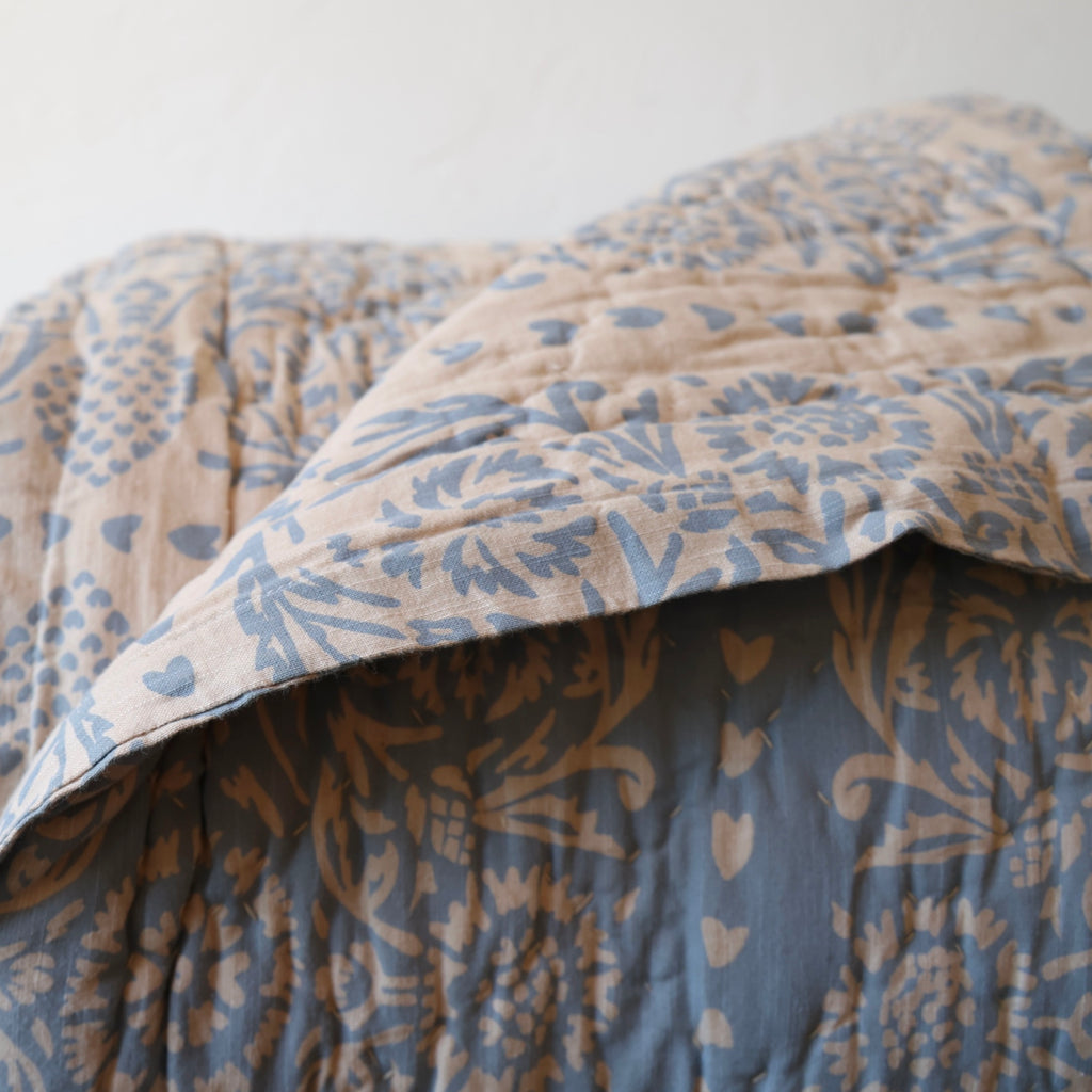 This pattern was inspired by antique painted tilework John found while exploring Lisbon, Portugal. The color is a beautiful cloud blue and natural. The reverse side of both the quilt and shams has the inverse colors. A beautiful, versatile pattern - it goes with many different styles and is fun to mix. Printed on super soft slub chambray.