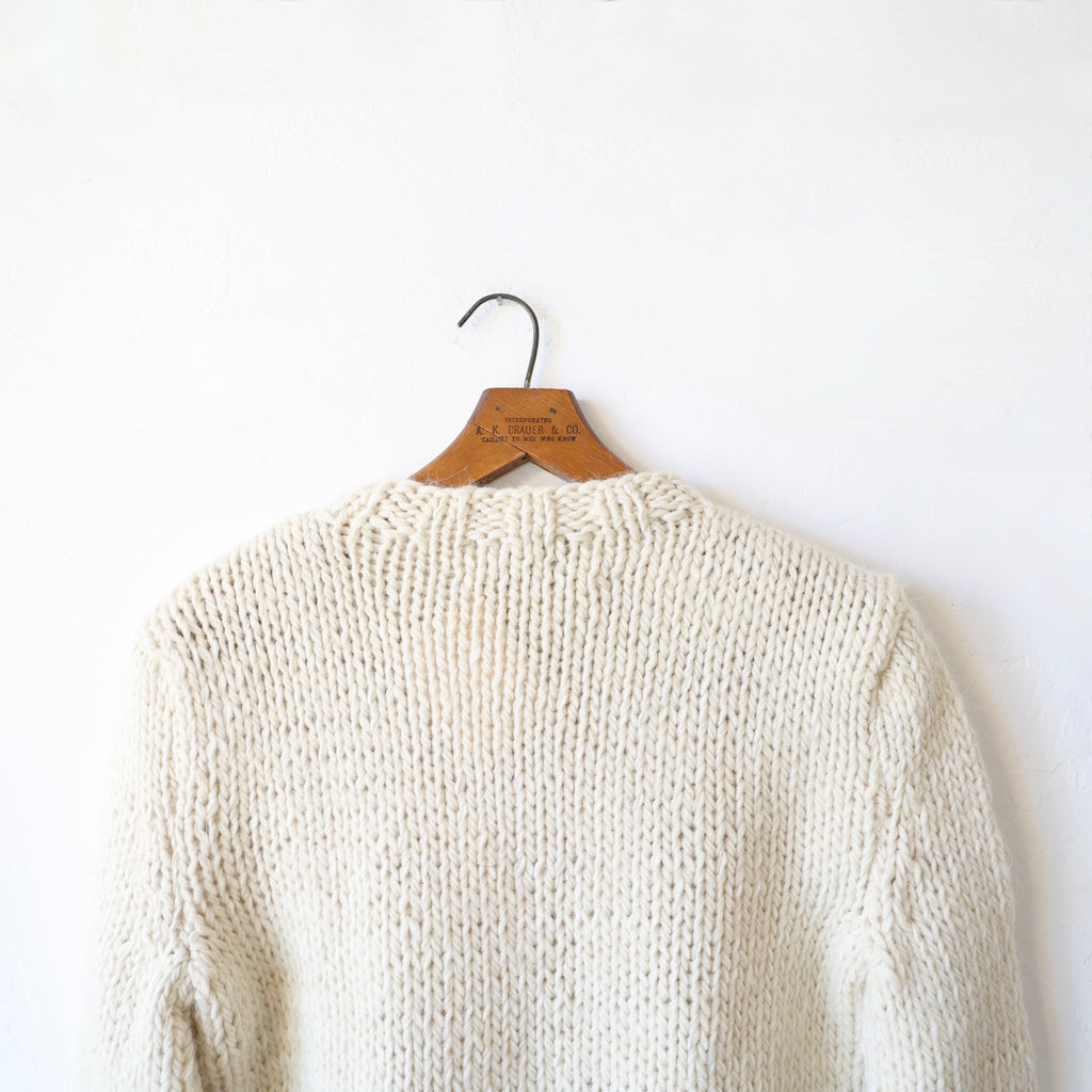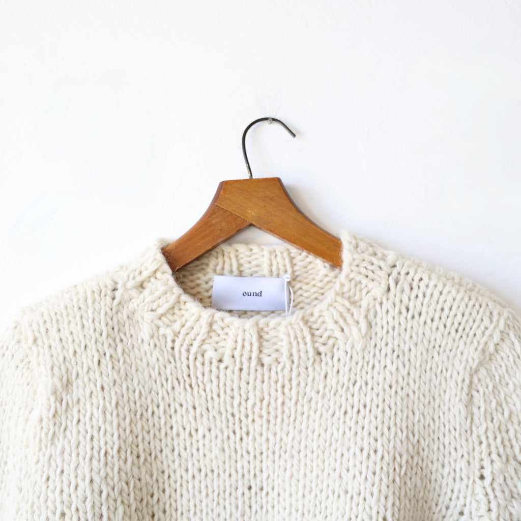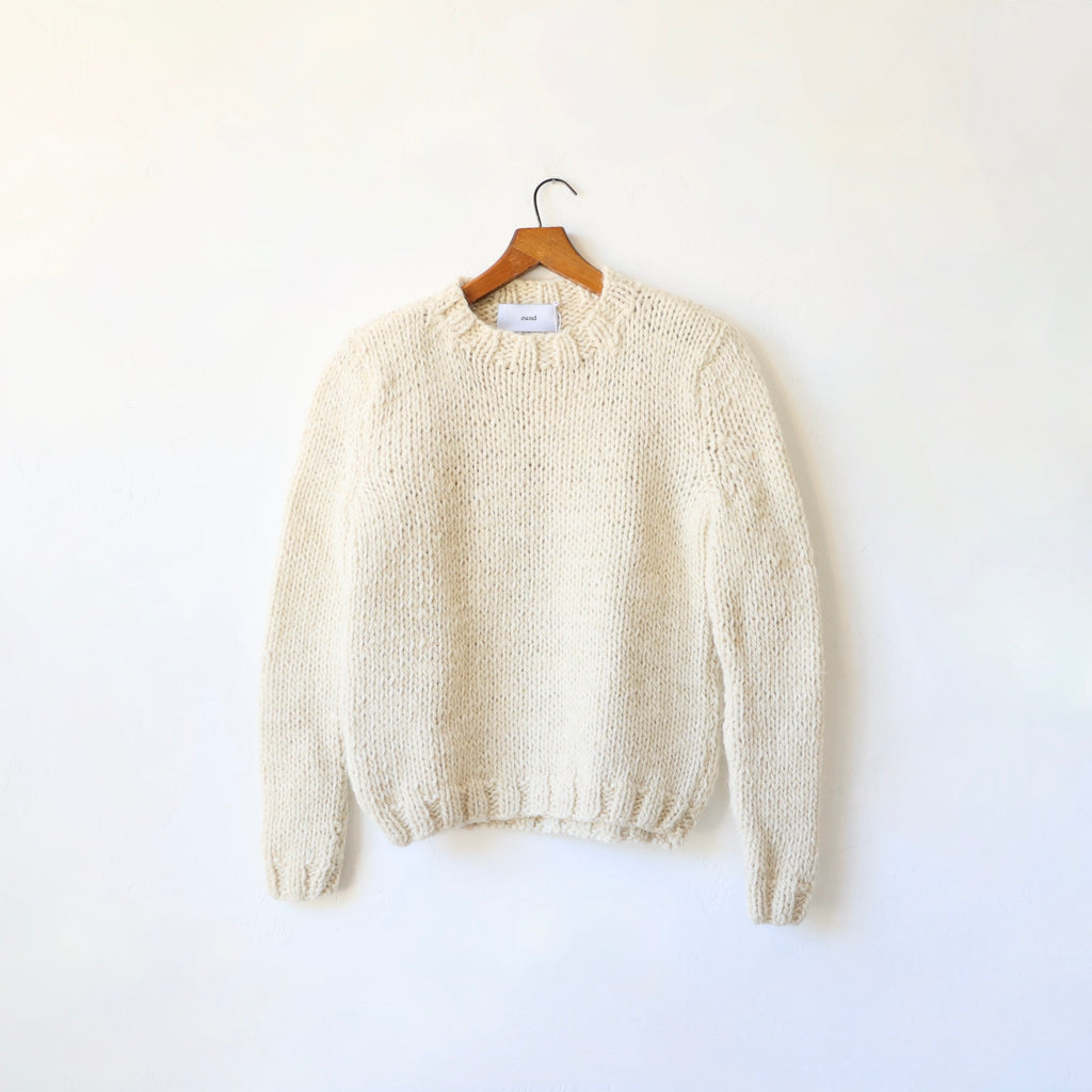 This is such a beautiful sweater - made of a super soft alpaca & merino mix in a classic, simple stockinette stitch with wide ribbing around the neckline, cuffs and hem. The alpaca and merino is a chunky yarn, giving this a wonderfully rustic, organic look. The fibers are undyed and the yarn is knit by female artisans and hand finished in Ound's studio. The wool is renewable, breathable and naturally elastic... softening and adapting to you over time. We love this with winter whites, jeans... you name it! We show it on Jettie with one of our Bon Ruffle Shirts in white underneath.