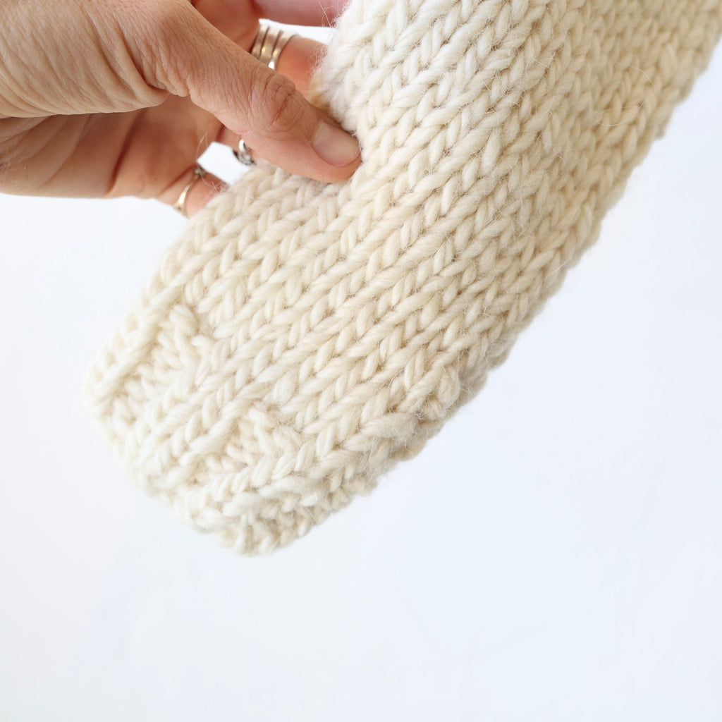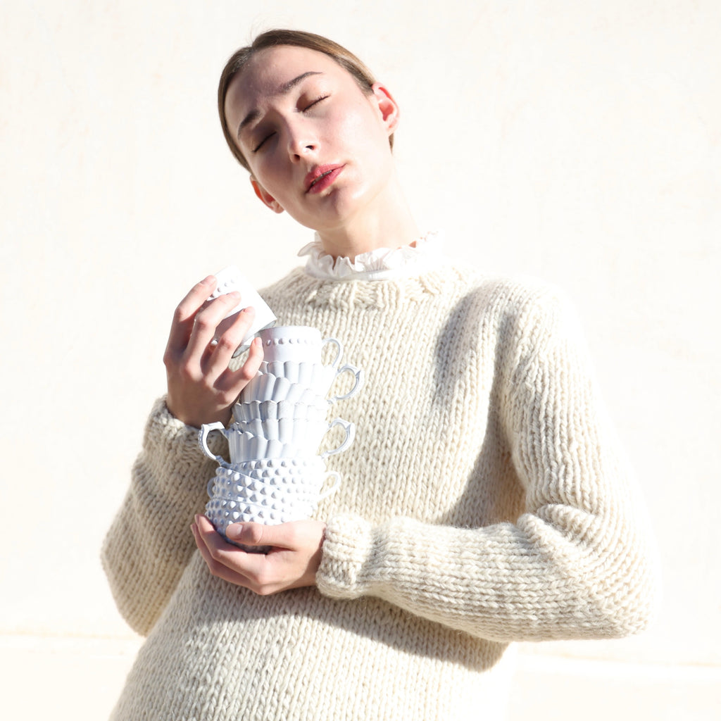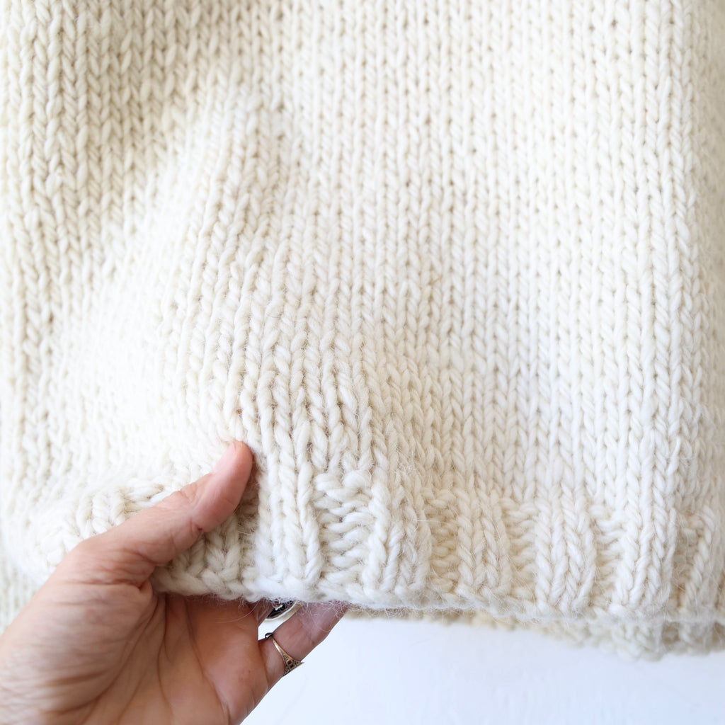 This is such a beautiful sweater - made of a super soft alpaca & merino mix in a classic, simple stockinette stitch with wide ribbing around the neckline, cuffs and hem. The alpaca and merino is a chunky yarn, giving this a wonderfully rustic, organic look. The fibers are undyed and the yarn is knit by female artisans and hand finished in Ound's studio. The wool is renewable, breathable and naturally elastic... softening and adapting to you over time. We love this with winter whites, jeans... you name it! We show it on Jettie with one of our Bon Ruffle Shirts in white underneath.