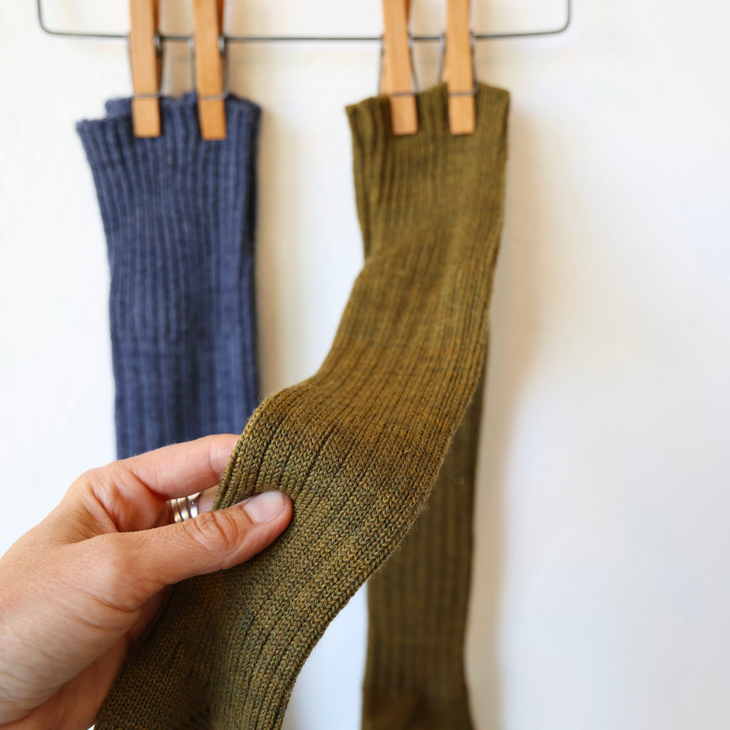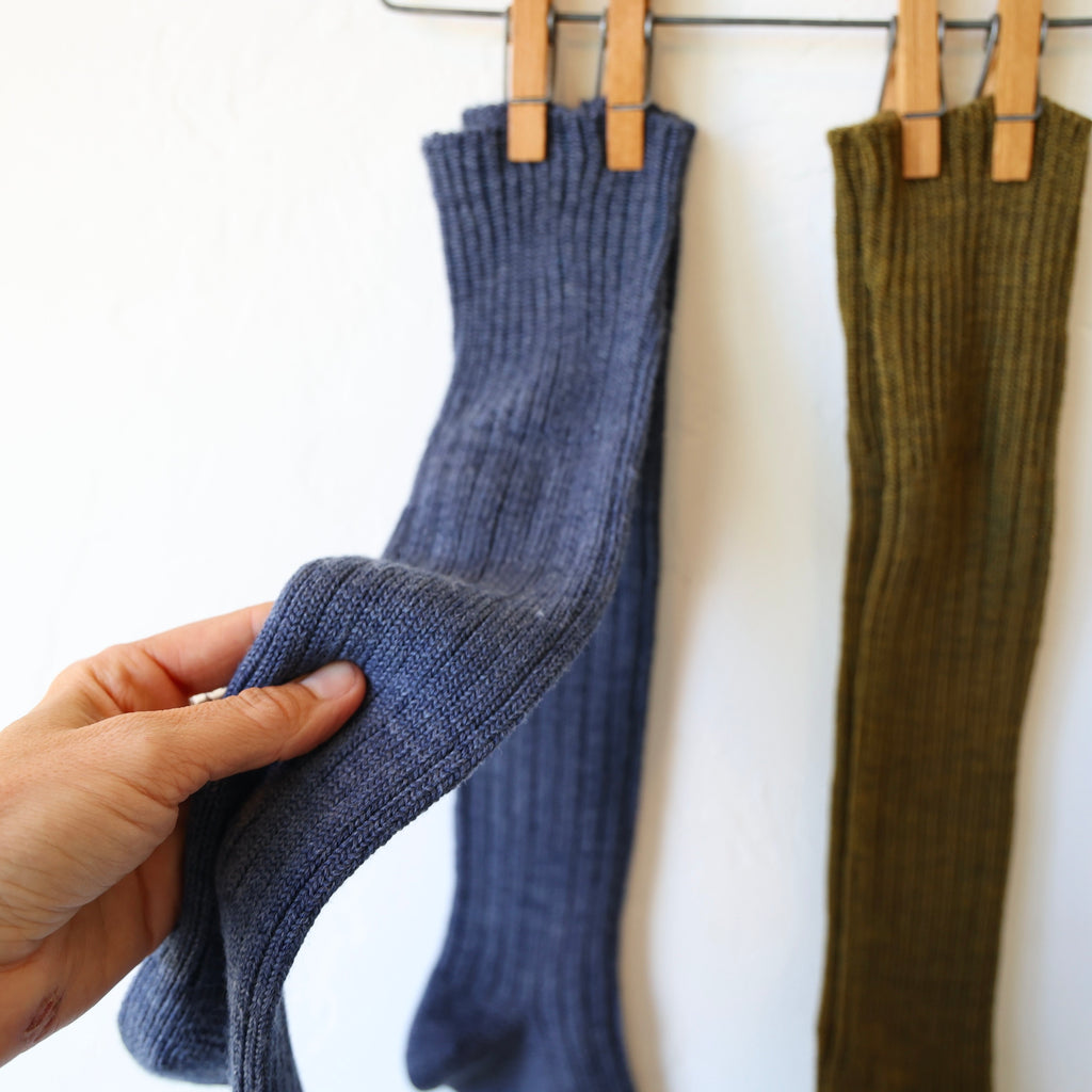Gorgeous socks with a wonderful long length to keep you warm! These are made of a soft, ribbed wool with a hint of nylon for keeping their shape. Choose from two colors - a beautiful olive green and a denim blue.